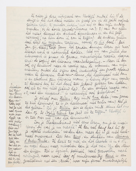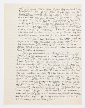 Toch, wat je me schrijft lijkt me ditmaal geheel juist; en dat wat voor jou ‘de juiste lijn’ is. - Ik ben erg benieuwd naar wat je van Ducroo zult zeggen als je de heele rommel bij elkaar ziet, en als dus het rhythme en de afwisseling van toon enz. van 500 blzn. zich laten gelden, en niet, zooals nu, wat losse fragmenten, die tenslotte toch in de ‘ruimte’ verloren gaan. Ik vind het eind - de laatste 3 hoofdstukken die eigenlijk totaal parallel gaan met De Smalle Mens (maar hoe zou het anders?) - allerminst ‘goed’; het hoeft ook niet ‘goed’ te zijn, als het maar in zekeren zin ‘fataal’ is. En het feit dat ik geprobeerd heb dit einde anders te krijgen, en dat het mij absoluut niet gelukt is, dat ik alléén dit kon maken en zelfs geen nuance verschillend, heeft op zichzelf iets imposants! Bovendien, als het maar niet vervelend is. Maar misschien zal jij ¾ van het boek vervelend vinden, lang vóór je aan het einde toe bent!