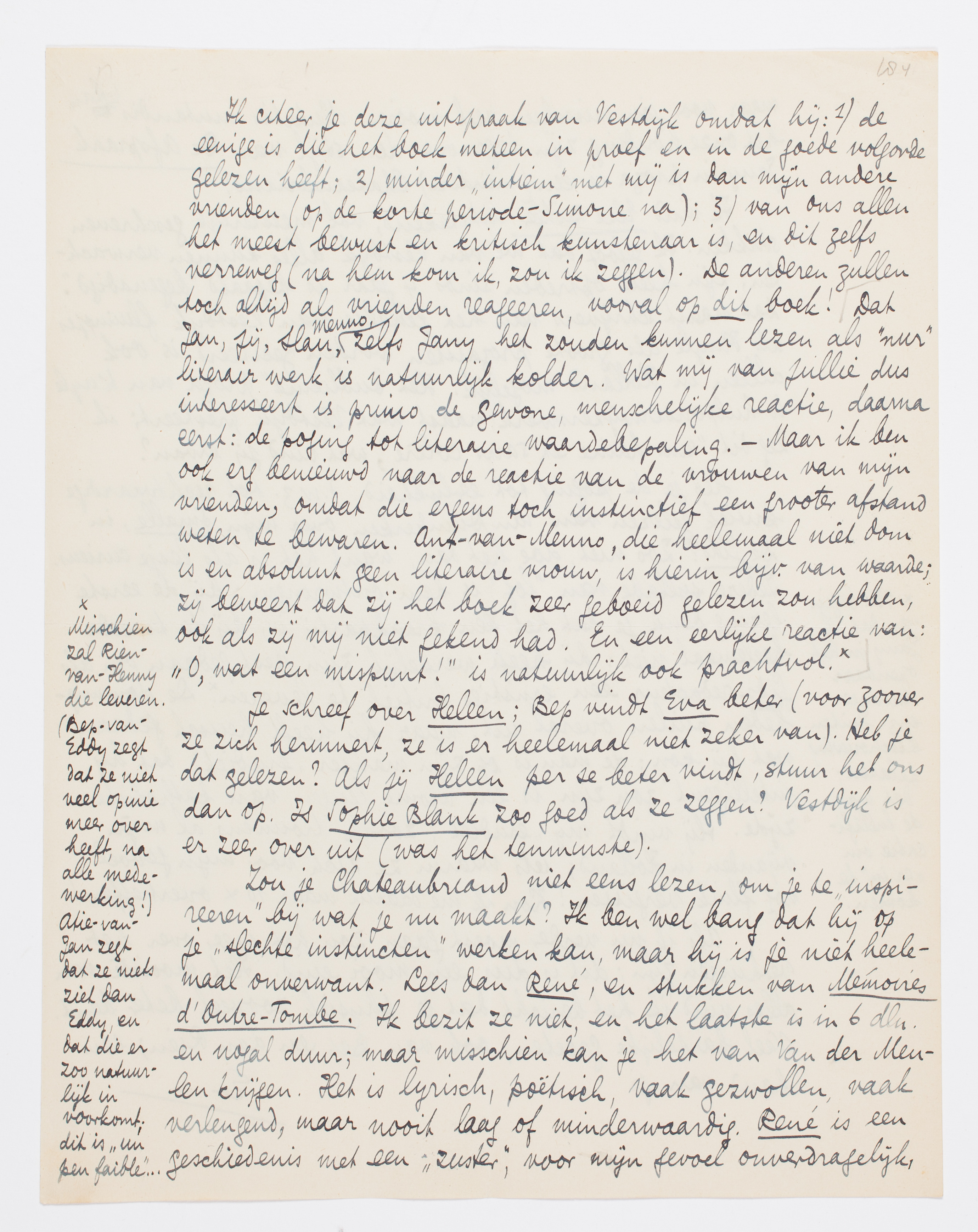 Dit is het eindoordeel van Vestdijk (die alles in proef doorging - ik heb daarna nog heel wat veranderd): ‘Je bent in [de laatste hfdstn] wel wat erg in de journalistiek verzeild geraakt [gebeurtenissen van Jan. en Febr. '34 in Parijs], maar het is te verdedigen, niets van den inhoud van dit boek uit te sluiten. [Hij bedoelt: van dit jaar, want Ducroo bestrijkt, in het heden, de tijd van Febr. '33 - een maand na den dood van mijn moeder - tot Febr. '34: het moment dat we van de oude Russen in de rue de l'Yvette weggingen om weer een eigen “huis” te hebben, de rue Erlanger dus]. In elk geval heb ik je roman met veel genoegen doorgelezen en zonder me één oogenblik te vervelen! [Dat is dus al beter dan wat ik van jou verwacht.] Wat beschrijvingskunst en stijl [toon?] betreft, staan er alvast dingen in, die niemand je zou verbeteren, maar ook psychologisch is het eersterangs, terwijl de zwakke kanten bijna zonder uitzondering terug te brengen zijn tot het idee waar je van uit bent gegaan’.