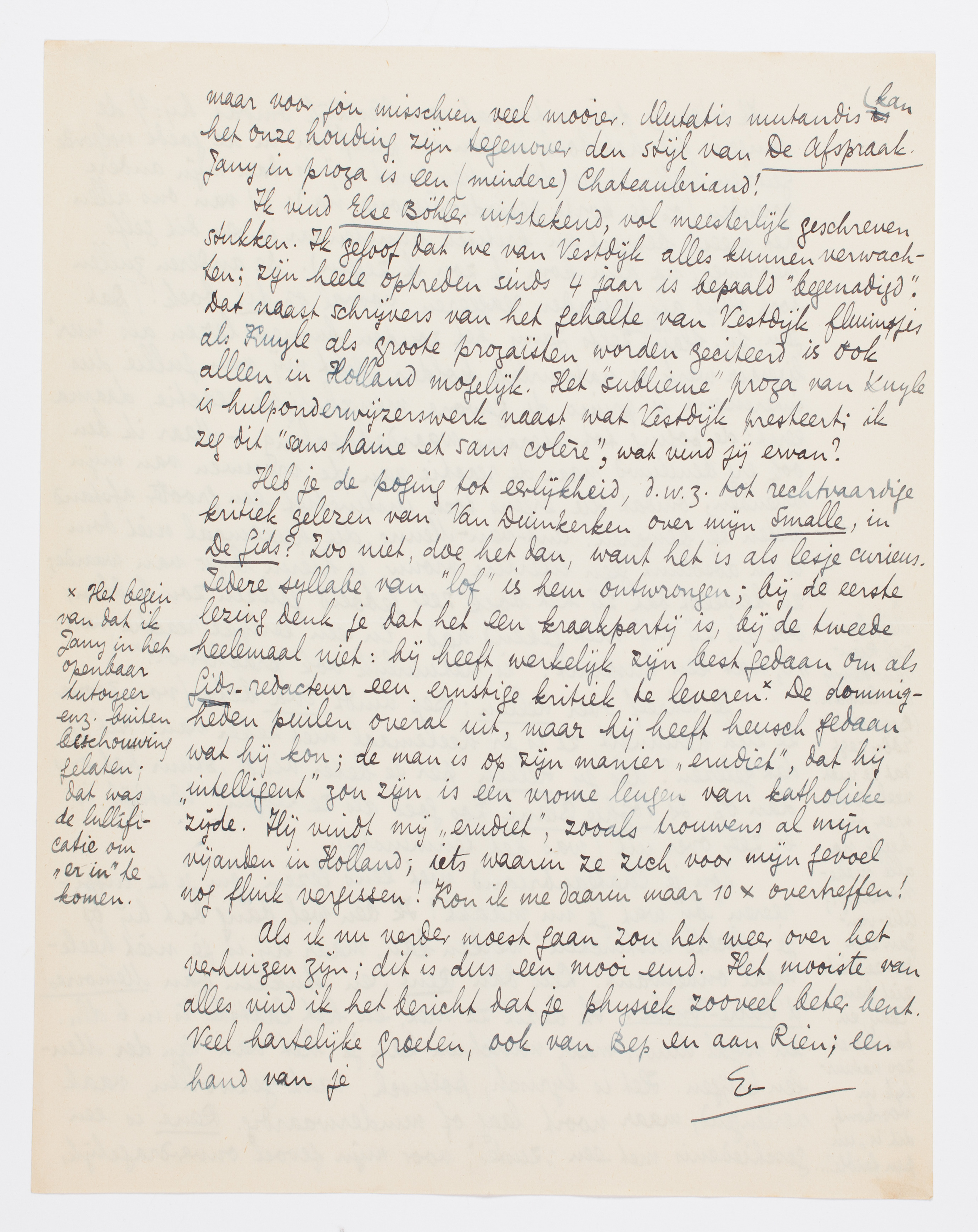 Ik vind Else Böhler uitstekend, vol meesterlijk geschreven stukken. Ik geloof dat we van Vestdijk alles kunnen verwachten; zijn heele optreden sinds 4 jaar is bepaald ‘begenadigd’. Dat naast schrijvers van het gehalte van Vestdijk fluimpjes als Kuyle als groote prozaïsten worden geciteerd is ook alleen in Holland mogelijk. Het ‘sublieme’ proza van Kuyle is hulponderwijzerswerk naast wat Vestdijk presteert; ik zeg dit ‘sans haine et sans colère’, wat vind jij ervan?