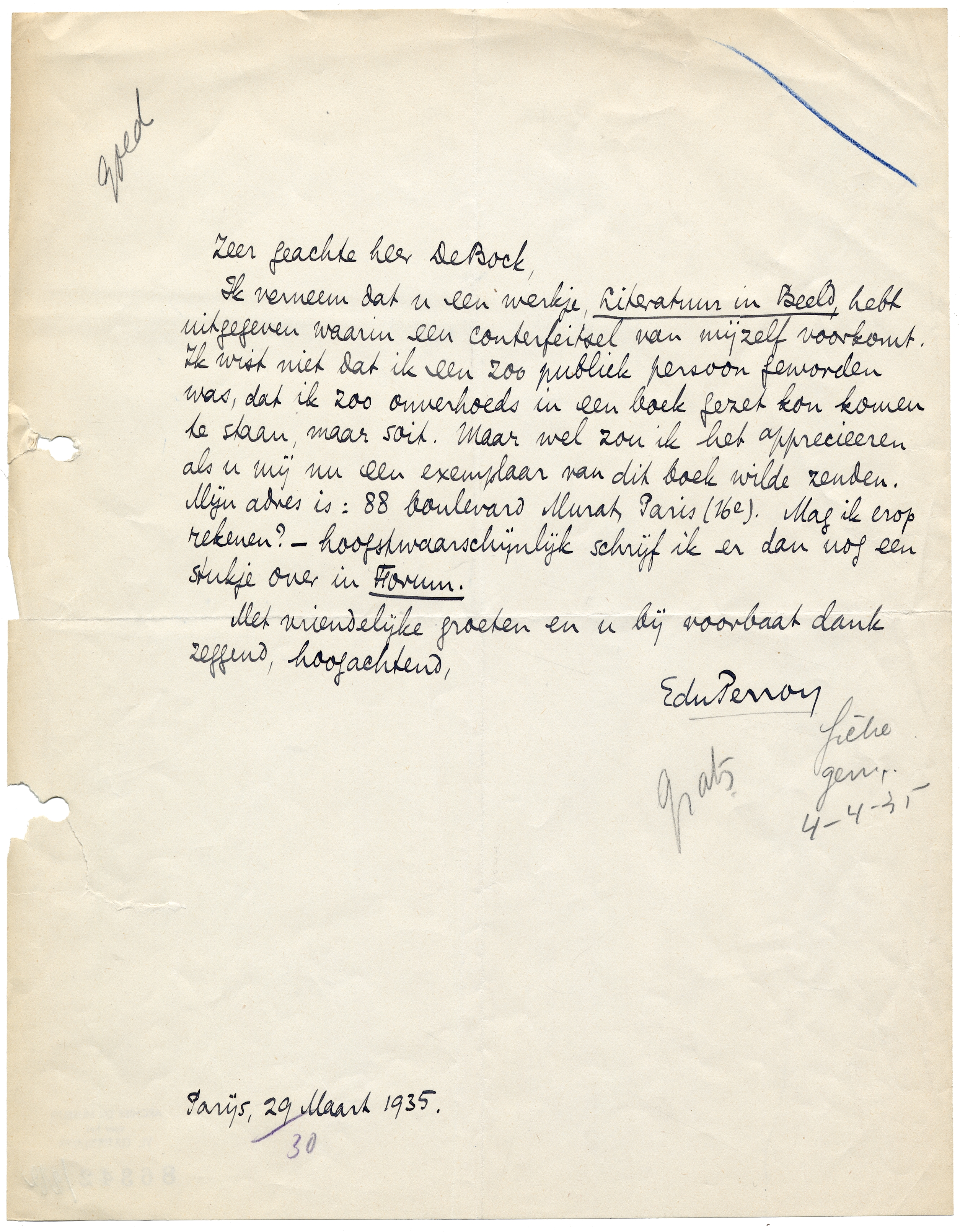 Ik verneem dat u een werkje, Literatuur in Beeld, hebt uitgegeven waarin een conterfeitsel van mijzelf voorkomt. Ik wist niet dat ik een zoo publiek persoon geworden was, dat ik zoo onverhoeds in een boek gezet kon komen te staan, maar soit. Maar wel zou ik het apprecieeren als u mij nu een exemplaar van dit boek wilde zenden. Mijn adres is: 88 boulevard Murat, Paris (16e). Mag ik erop rekenen? - hoogstwaarschijnlijk schrijf ik er dan nog een stukje over in Forum.3618