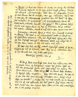 Je brief is mij een groote teleurstelling; althans, dreigt die kant uit te gaan. Zonder werk van Helman of Coolen kan ik mij onze bundel bèst voorstellen, maar zonder iets van jou erin, wordt mijn plezier vergald en voel ik mij als verantwoordelijk voor de keuze ‘geblameerd’. Misschien is er iets waars in Zijlstra's bewering, maar de concurrentienijd geeft zeker den doorslag, en wij zijn het werkelijk aan onszelf verplicht om onze uitgevers niet te vleien in hun laagste instincten. Als de bundel toch uitkomt, is het ‘gevaar’ even groot, en dan is het tenslotte nog beter dat jij er als ‘uitverkoren novellist’ in voorkomt, voor de RECLAME!*