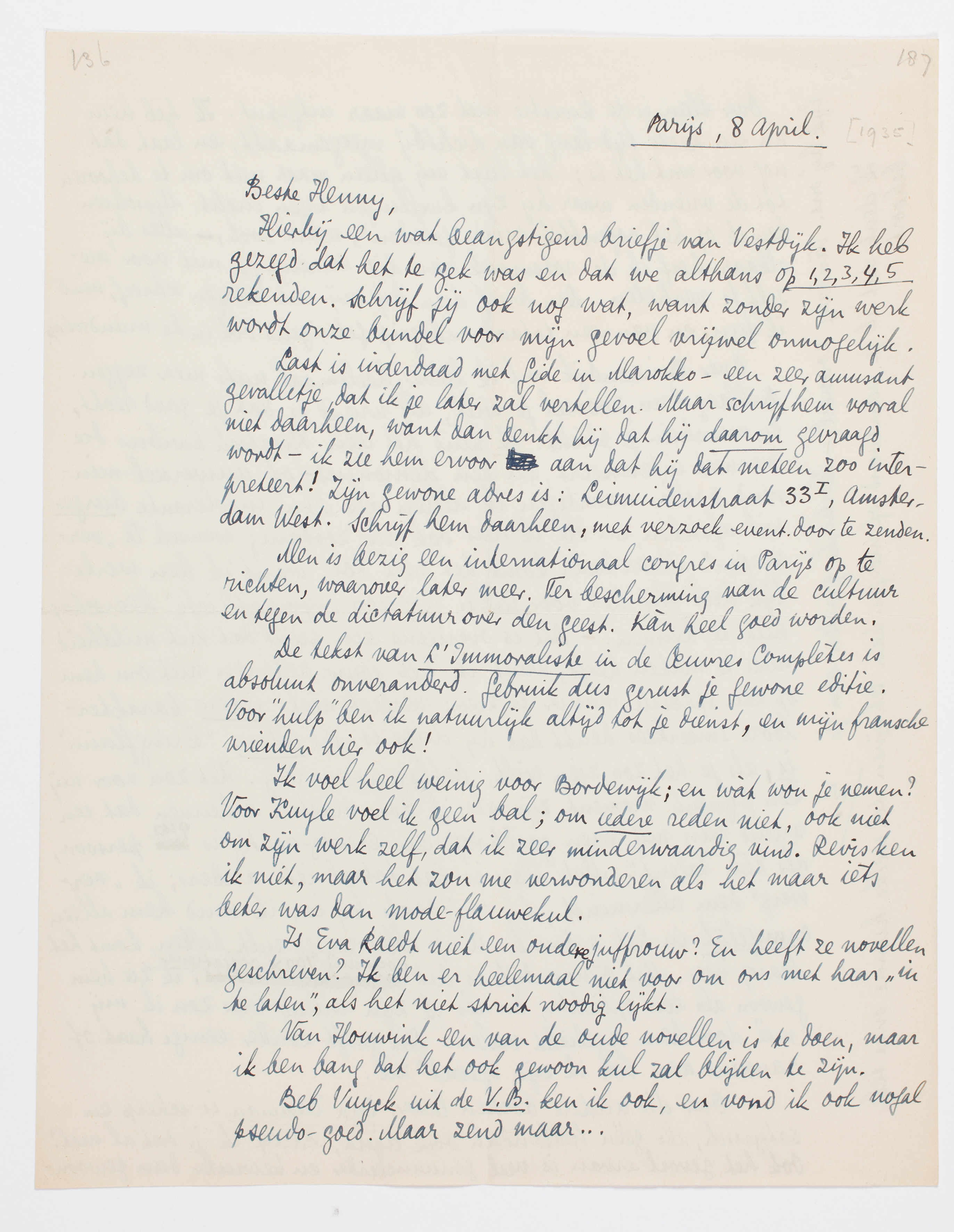 Last is inderdaad met Gide in Marokko - een zeer amusant gevalletje, dat ik je later zal vertellen. Maar schrijf hem vooral niet daarheen, want dan denkt hij dat hij daarom gevraagd wordt - ik zie hem ervoor aan dat hij dat meteen zoo interpreteert! Zijn gewone adres is: Leimuidenstraat 331, Amsterdam West. Schrijf hem daarheen, met verzoek event, door te zenden.