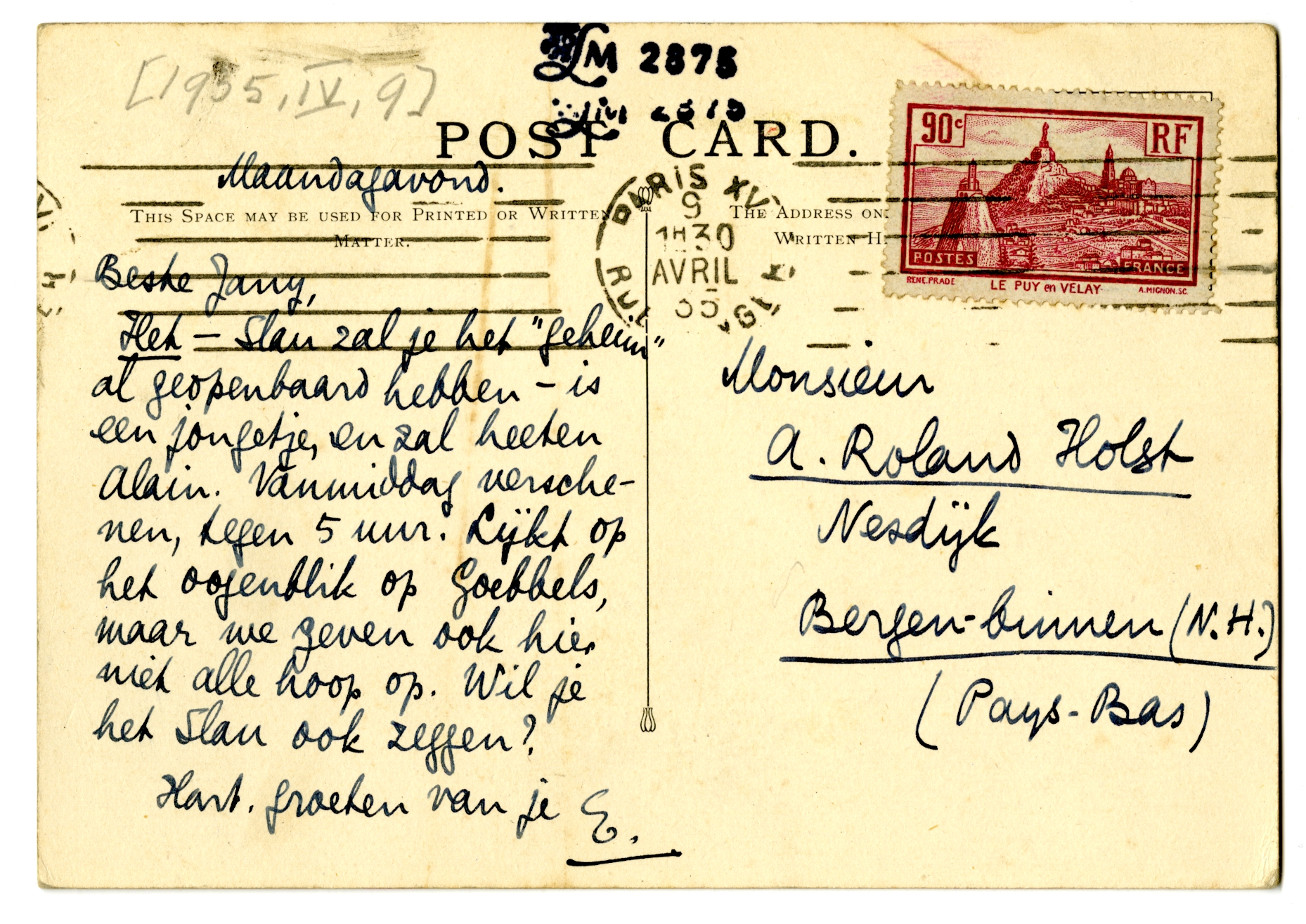 Het - Slau zal je het ‘geheim’ al geopenbaard hebben - is een jongetje, en zal heeten Alain. Vanmiddag verschenen, tegen 5 uur. Lijkt op het oogenblik op Goebbels, maar we geven ook hier niet alle hoop op. Wil je het Slau ook zeggen?