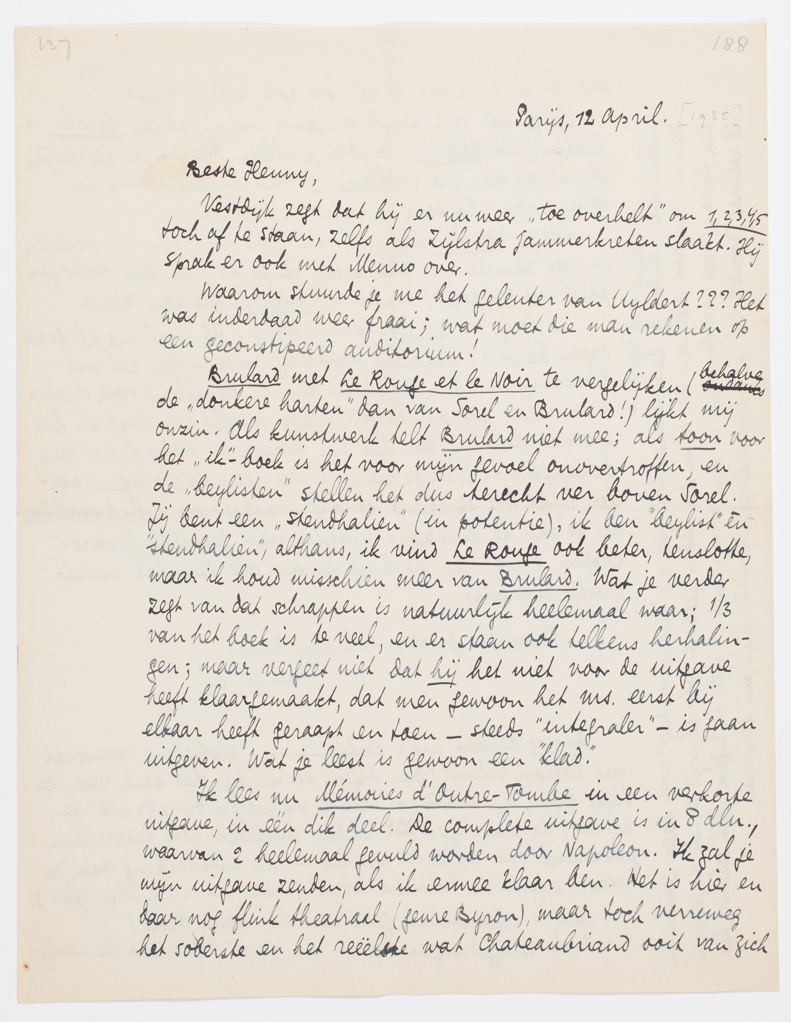 Brulard met Le Rouge et le Noir te vergelijken (behalve de ‘donkere harten’3660 dan van Sorel en Brulard!) lijkt mij onzin. Als kunstwerk telt Brulard niet mee; als toon voor het ‘ik’-boek is het voor mijn gevoel onovertroffen, en de ‘beylisten’ stellen het dus terecht ver boven Sorel. Jij bent een ‘stendhalien’ (in potentie), ik ben ‘beylist’ èn ‘stendhalien’, althans, ik vind Le Rouge ook beter, tenslotte, maar ik houd misschien meer van Brulard. Wat je verder zegt van dat schrappen is natuurlijk heelemaal waar; 1/3 van het boek is te veel, en er staan ook telkens herhalingen; maar vergeet niet dat hij het niet voor de uitgave heeft klaargemaakt, dat men gewoon het ms. eerst bij elkaar heeft geraapt en toen - steeds ‘integraler’ - is gaan uitgeven. Wat je leest is gewoon een ‘klad’.