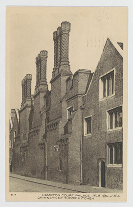 3671Prentbriefkaart: foto van Hampton Court Palace te Londen: Chimneys of Tudor kitchen.