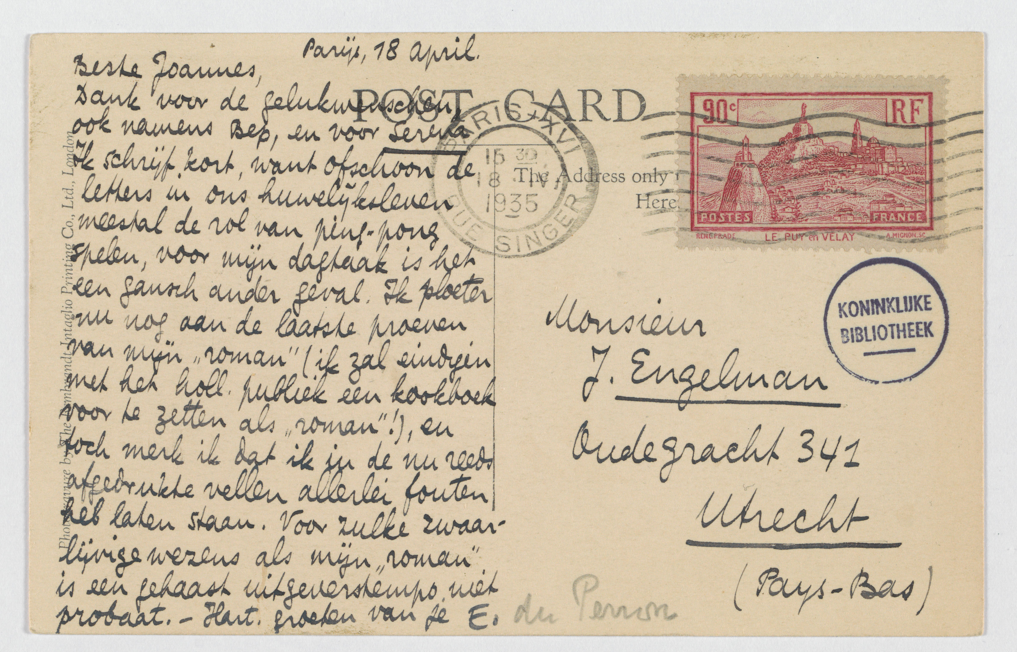 Dank voor de gelukwenschen, ook namens Bep, en voor Serena. Ik schrijf kort, want ofschoon de letters in ons huwelijksleven meestal de rol van ping-pong spelen, voor mijn dagtaak is het een gansch ander geval. Ik ploeter nu nog aan de laatste proeven van mijn ‘roman’ (ik zal eindigen met het holl. publiek een kookboek voor te zetten als ‘roman’!), en toch merk ik dat ik in de nu reeds afgedrukte vellen allerlei fouten heb laten staan. Voor zulke zwaarlijvige wezens als mijn ‘roman’ is een gehaast uitgeverstempo niet probaat. - Hart groeten van je