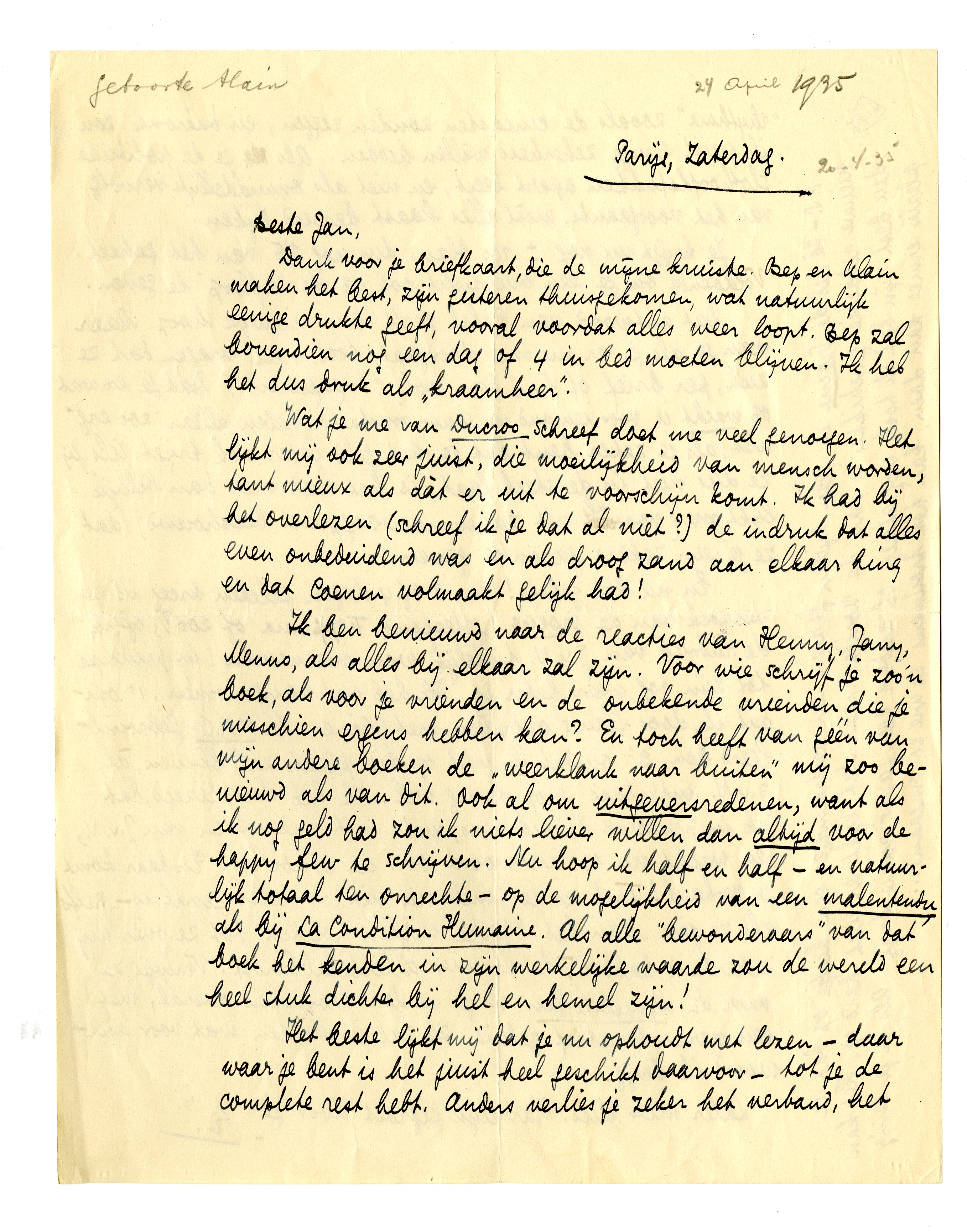 Ik ben benieuwd naar de reacties van Henny, Jany, Menno, als alles bij elkaar zal zijn. Voor wie schrijf je zoo'n boek, als voor je vrienden en de onbekende vrienden die je misschien ergens hebben kan? En toch heeft van géén van mijn andere boeken de ‘weerklank naar buiten’ mij zoo benieuwd als van dit. Ook al om uitgeversredenen, want als ik nog geld had zou ik niets liever willen dan altijd voor de happy few te schrijven. Nu hoop ik half en half - en natuurlijk totaal ten onrechte - op de mogelijkheid van een malentendu als bij La Condition Humaine. Als alle ‘bewonderaars’ van dat boek het kenden in zijn werkelijke waarde zou de wereld een heel stuk dichter bij hel en hemel zijn!