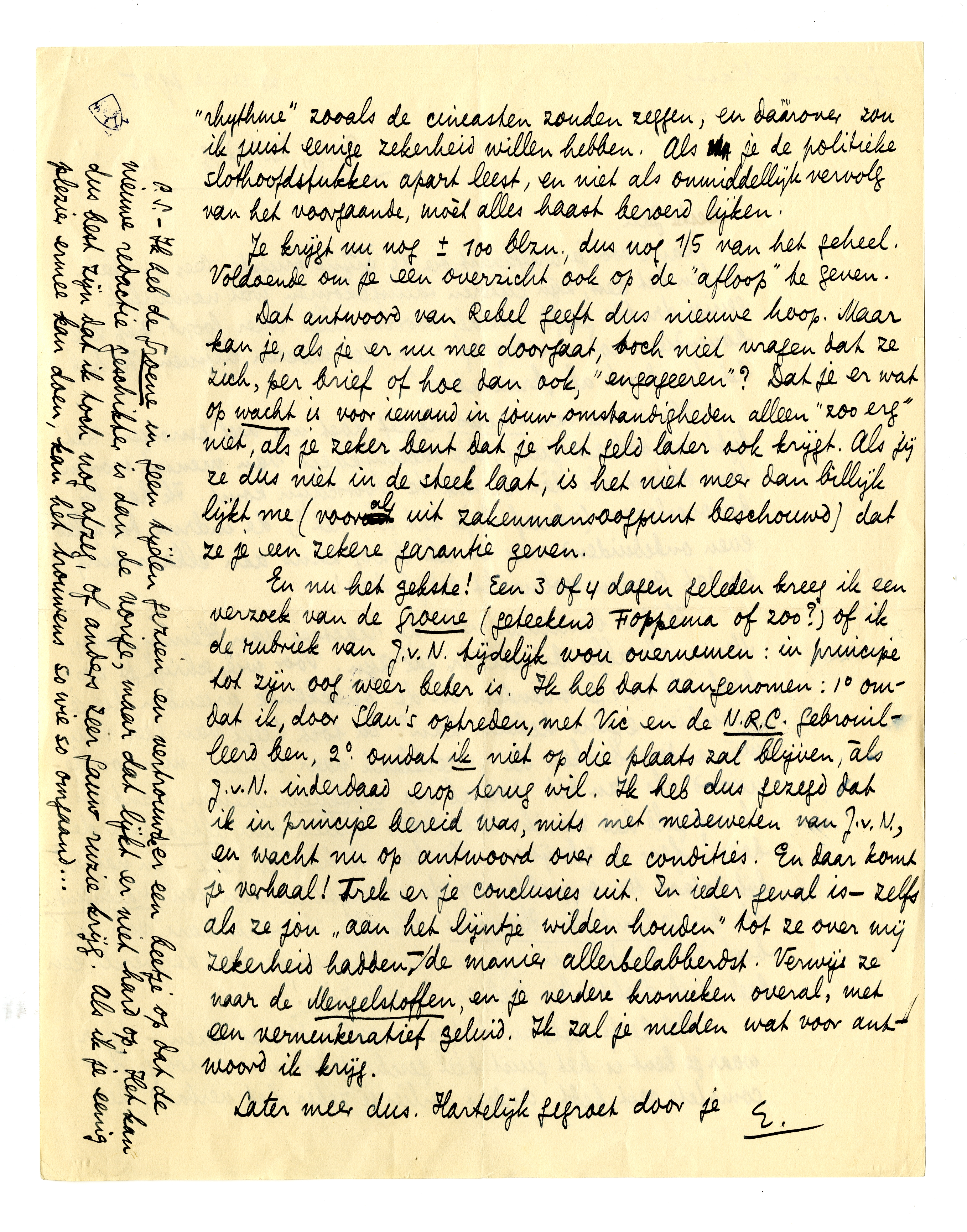 P.S. - Ik heb de Groene in geen tijden gezien en vertrouwde er een beetje op dat de nieuwe redactie geschikter is dan de vorige, maar dat lijkt er niet hard op.3682 Het kan dus best zijn dat ik toch nog afzeg, of anders zeer gauw ruzie krijg. Als ik je eenig plezier ermee kan doen, kan het trouwens so wie so omgaand...