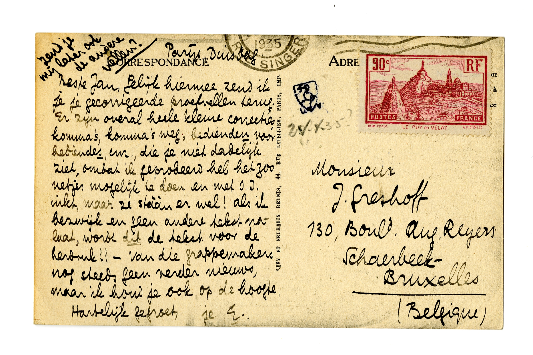 Beste Jan, Gelijk hiermee zend ik je je gecorrigeerde proefvellen terug. Er zijn overal heele kleine correcties, komma's, komma's weg, bedienden voor bediendes, enz., die je niet dadelijk ziet, omdat ik geprobeerd heb het zoo netjes mogelijk te doen en met O.I. inkt, maar ze stààn er wel! Als ik bezwijk en geen andere tekst nalaat, wordt dit de tekst voor de herdruk!! - Van die grappemakers nog steeds geen verder nieuws, maar ik houd je ook op de hoogte.