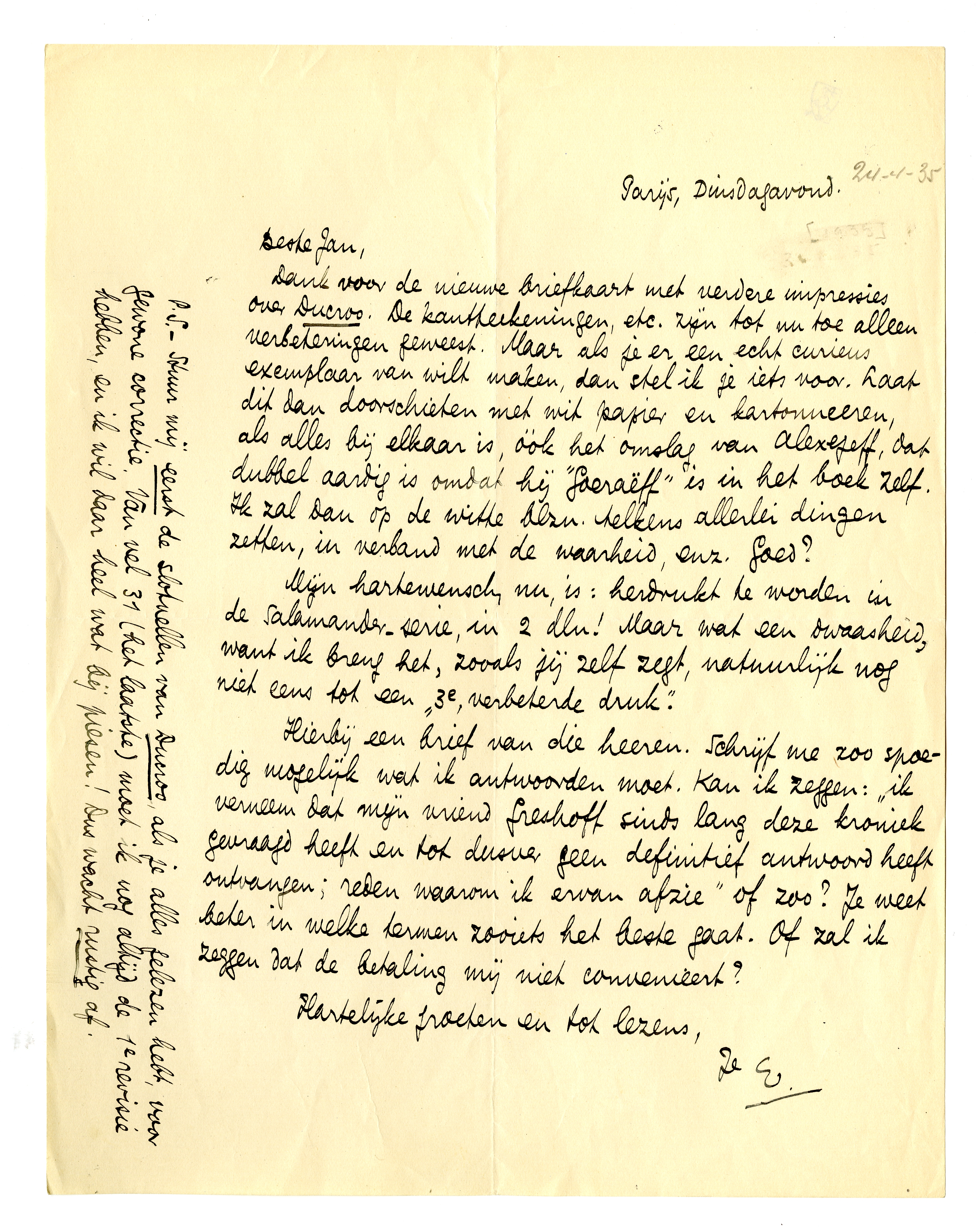 P.S. - Stuur mij eerst de slotvellen van Ducroo, als je alles gelezen hebt, voor gewone correctie. Van vel 31 (het laatste) moet ik nog altijd de 1e revisie hebben, en ik wil daar heel wat bij piesen! Dus wacht rustig af.