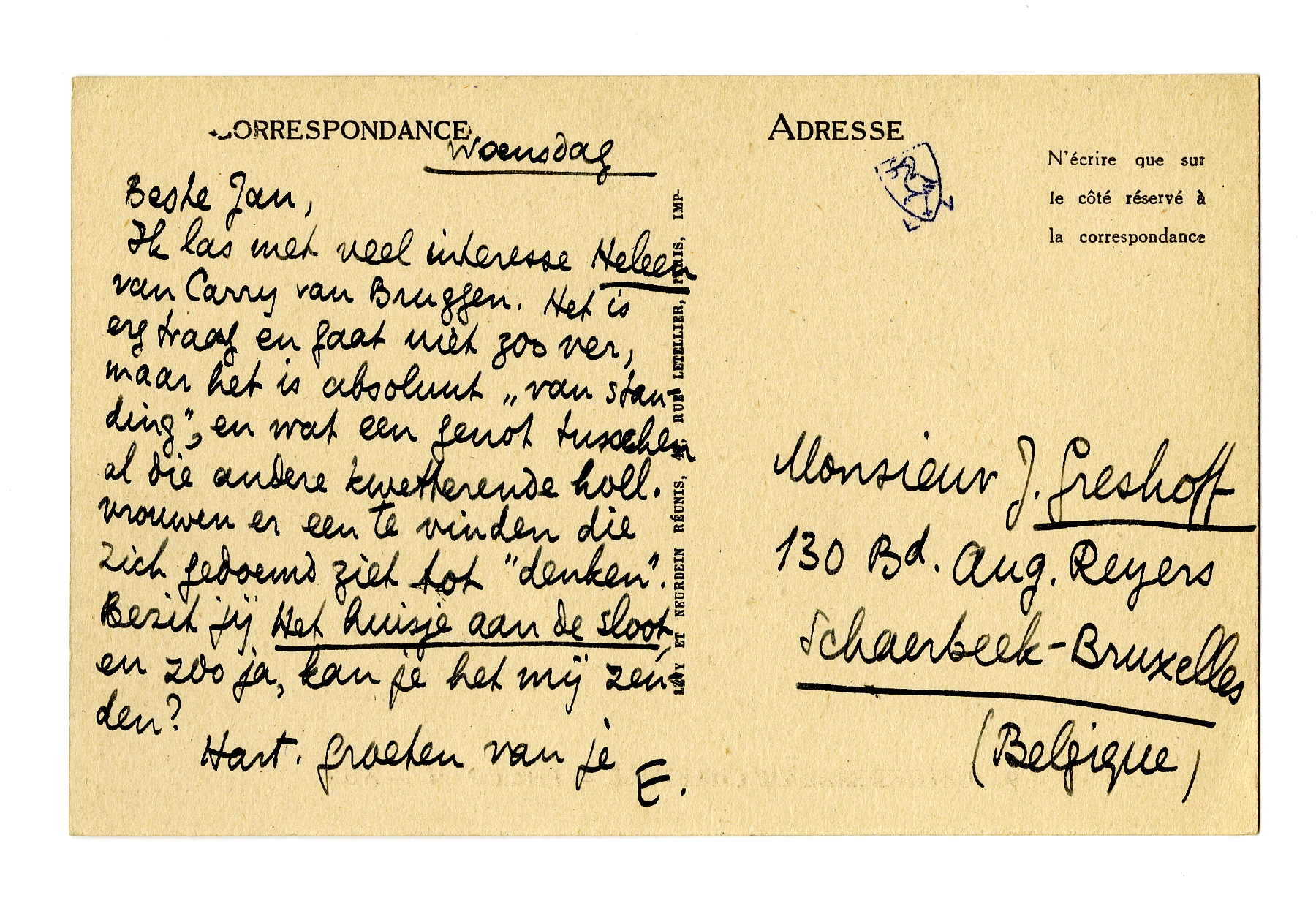 Ik las met veel interesse Heleen van Carry van Bruggen. Het is erg traag en gaat niet zoo ver, maar het is absoluut ‘van standing’, en wat een genot tusschen al die andere kwetterende holl. vrouwen er een te vinden die zich gedoemd ziet tot ‘denken’. Bezit jij Het huisje aan de sloot, en zoo ja, kan je het mij zenden?