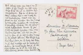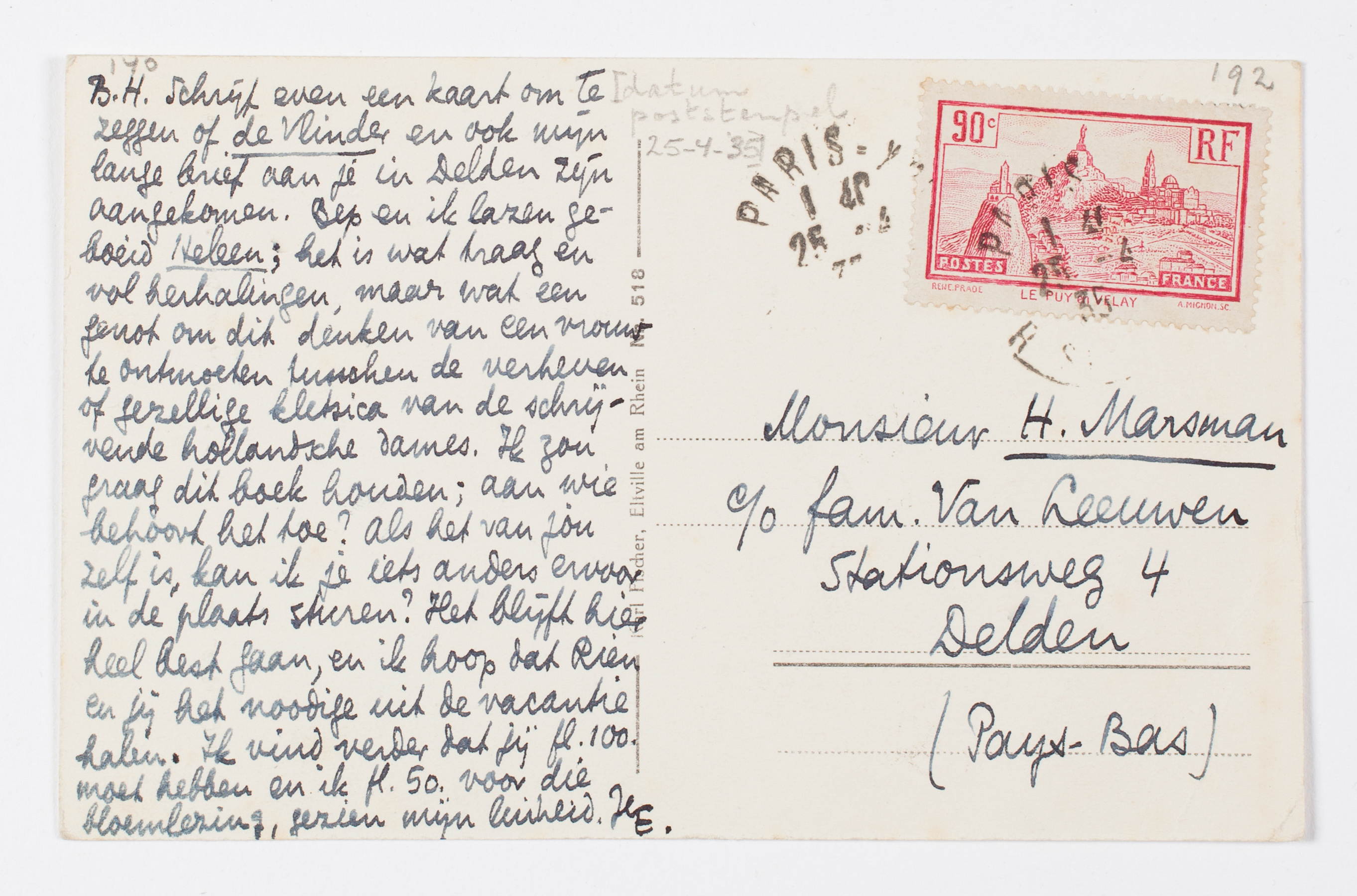B.H. Schrijf even een kaart om te zeggen of de Vlinder en ook mijn lange brief3694 aan je in Delden zijn aangekomen. Bep en ik lazen geboeid Heleen; het is wat traag en vol herhalingen, maar wat een genot om dit denken van een vrouw te ontmoeten tusschen de ver-heven of gezellige kletsica van de schrijvende hollandsche dames. Ik zou graag dit boek houden; aan wie behoort het toe? Als het van jou zelf is, kan ik je iets anders ervoor in de plaats sturen? Het blijft hier heel best gaan, en ik hoop dat Rien en jij het noodige uit de vacantie halen. Ik vind verder dat jij fl. 100. moet hebben en ik fl. 50. voor die bloemlezing, gezien mijn luiheid. Je