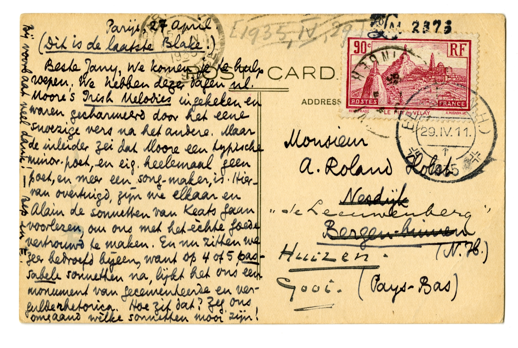 Beste Jany, We komen je te hulp roepen. We hebben dezer dagen nl. Moore's Irish Melodies ingekeken en waren gecharmeerd door het eene snoezige vers na het andere. Maar de inleider zei dat Moore een typische minor-poet, en eig. heelemaal geen poet, en meer een songmaker, is. Hiervan overtuigd, zijn we elkaar en Alain de sonnetten van Keats gaan voorlezen, om ons met het èchte goede vertrouwd te maken. En nu zitten we zeer bedroefd bijeen, want op 4 of 5 passabele sonnetten na, lijkt het ons een monument van gecementeerde en vergulde rhetorica. Hoe zit dat? Zeg ons omgaand wèlke sonnetten mooi zijn! Bij voorbaat veel dank!