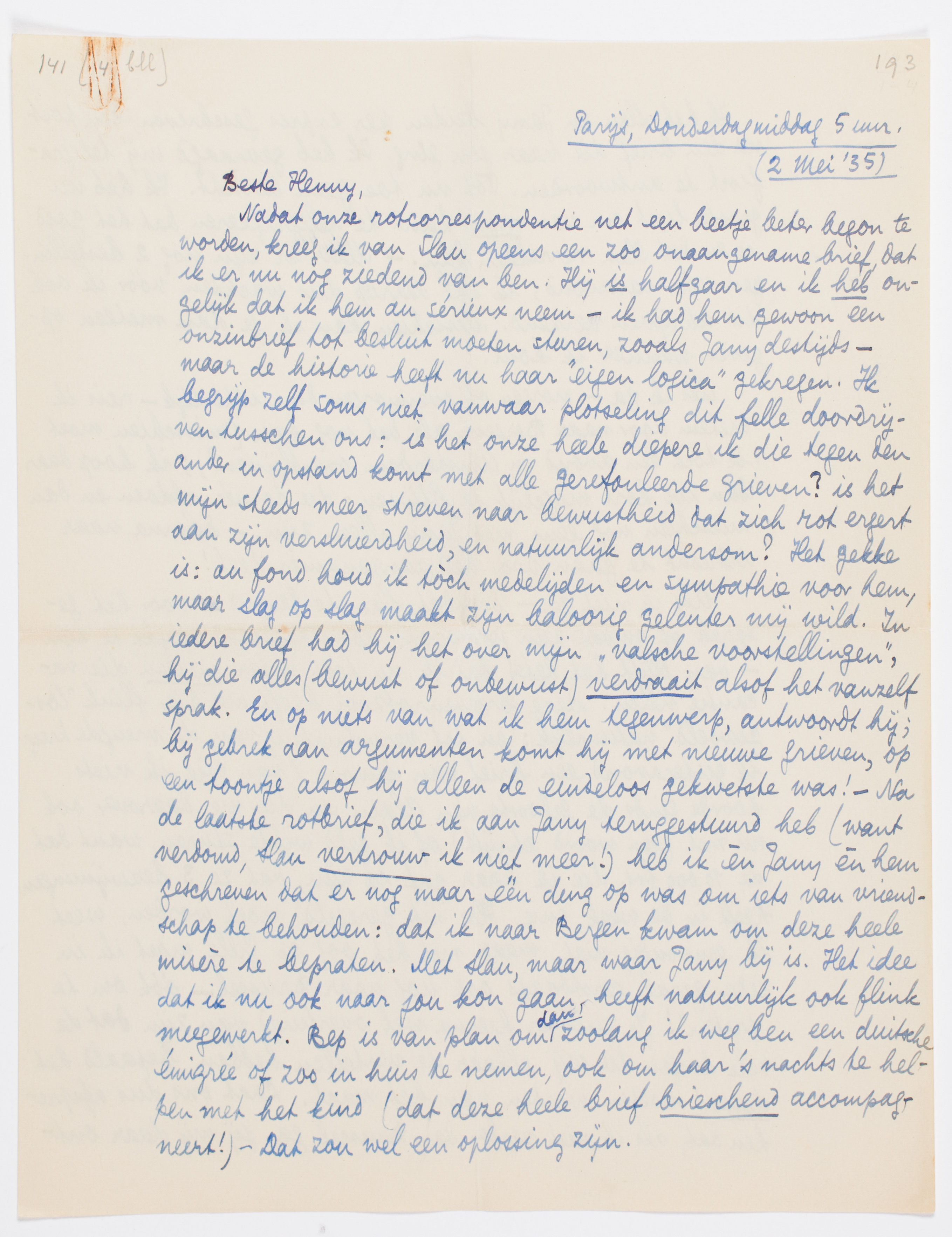 Nadat onze rotcorrespondentie net een beetje beter begon te worden, kreeg ik van Slau opeens een zoo onaangename brief, dat ik er nu nog ziedend van ben. Hij is halfgaar en ik heb ongelijk dat ik hem au sérieux neem - ik had hem gewoon een onzinbrief tot besluit moeten sturen, zooals Jany destijds - maar de historie heeft nu haar ‘eigen logica’ gekregen. Ik begrijp zelf soms niet vanwaar plotseling dit felle doordrijven tusschen ons: is het onze heele diepere ik die tegen den ander in opstand komt met alle gerefouleerde grieven? is het mijn steeds meer streven naar bewustheid dat zich rot ergert aan zijn versluierdheid, en natuurlijk andersom? Het gekke is: au fond houd ik tòch medelijden en sympathie voor hem, maar slag op slag maakt zijn baloorig geleuter mij wild. In iedere brief had hij het over mijn ‘valsche voorstellingen’, hij die alles (bewust of onbewust) verdraait alsof het vanzelf sprak. En op niets van wat ik hem tegenwerp, antwoordt hij; bij gebrek aan argumenten komt hij met nieuwe grieven, op een toontje alsof hij alleen de eindeloos gekwetste was! - Na de laatste rotbrief, die ik aan Jany teruggestuurd heb (want verdomd, Slau vertrouw ik niet meer!) heb ik èn Jany èn hem geschreven dat er nog maar één ding op was om iets van vriendschap te behouden: dat ik naar Bergen kwam om deze heele misère te bepraten. Met Slau, maar waar Jany bij is. Het idee dat ik nu ook naar jou kon gaan, heeft natuurlijk ook flink meegewerkt. Bep is van plan om dan zoolang ik weg ben een duitsche émi-grée of zoo in huis te nemen, ook om haar 's nachts te helpen met het kind (dat deze heele brief brieschend accompagneert!) - Dat zou wel een oplossing zijn.