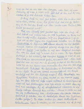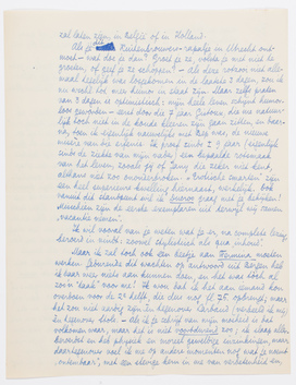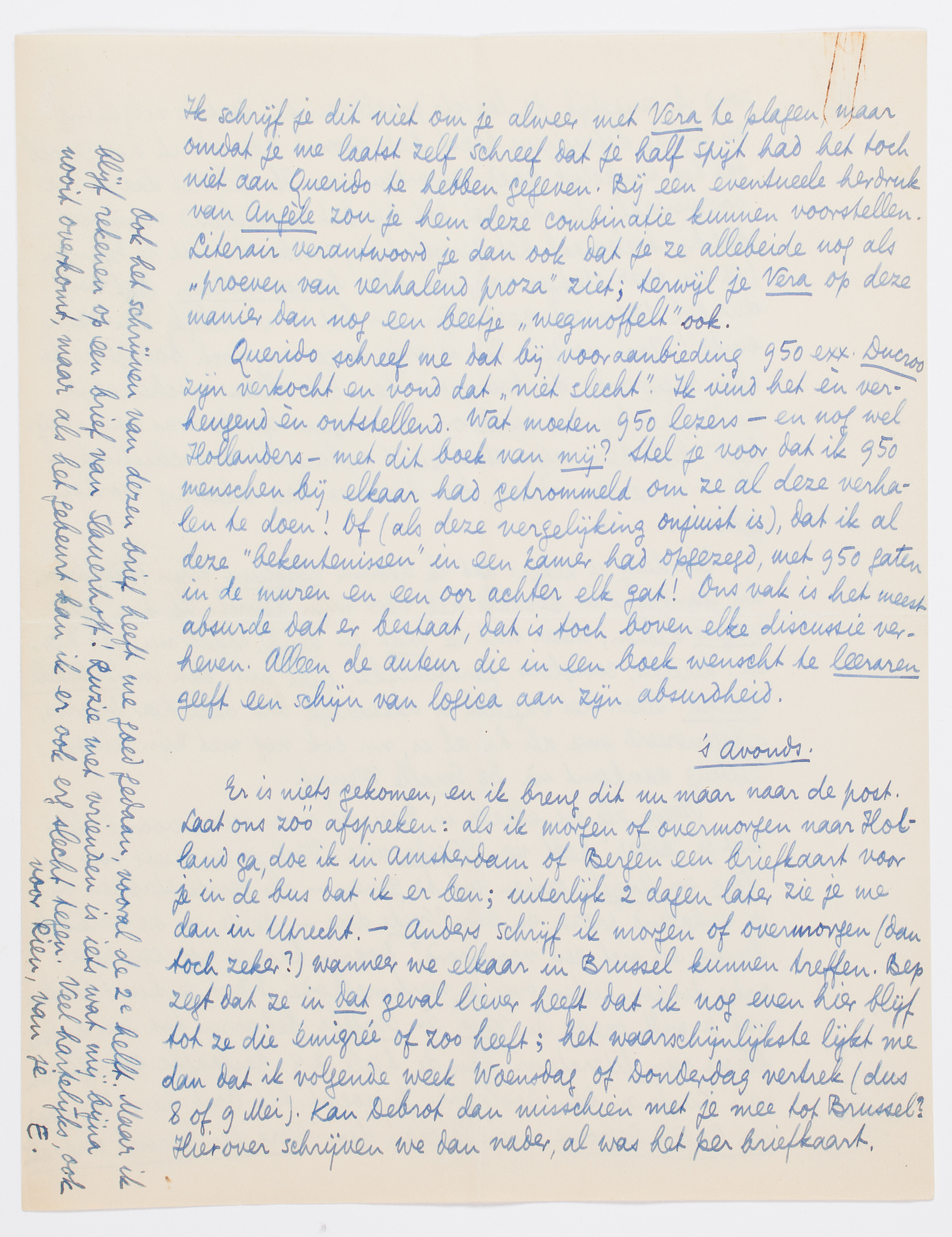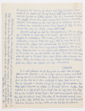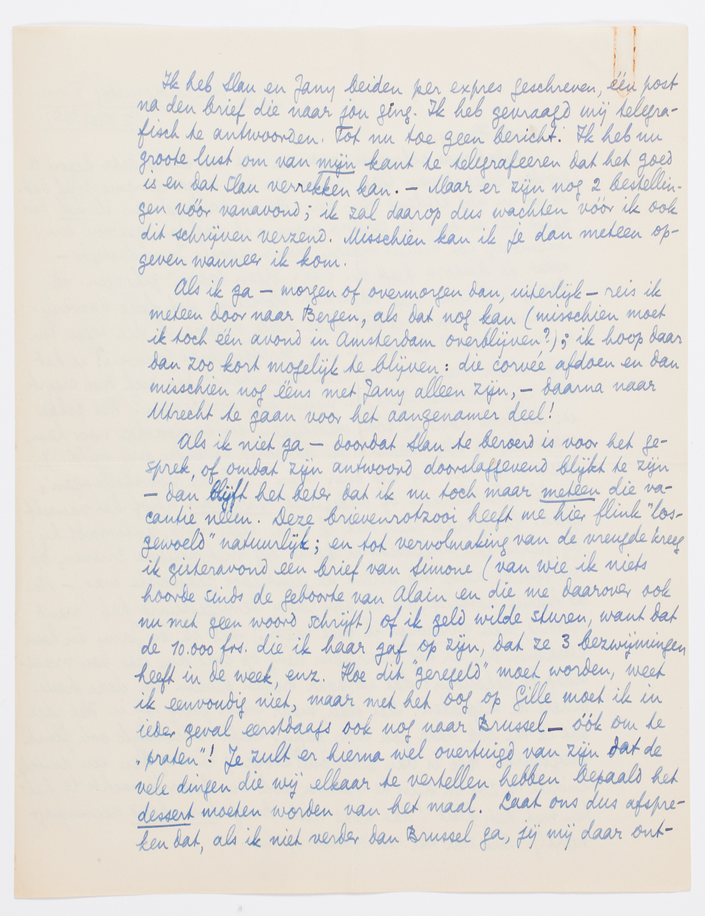 Er is niets gekomen, en ik breng dit nu maar naar de post. Laat ons zóó afspreken: als ik morgen of overmorgen naar Holland ga, doe ik in Amsterdam of Bergen een briefkaart voor je in de bus dat ik er ben; uiterlijk 2 dagen later zie je me dan in Utrecht. - Anders schrijf ik morgen of overmorgen (dan toch zeker?) wanneer we elkaar in Brussel kunnen treffen. Bep zegt dat ze in dat geval liever heeft dat ik nog even hier blijf tot ze die émigrée of zoo heeft; het waarschijnlijkste lijkt me dan dat ik volgende week Woensdag of Donderdag vertrek (dus 8 of 9 Mei). Kan Debrot dan misschien met je mee tot Brussel? Hierover schrijven we dan nader, al was het per briefkaart.