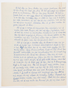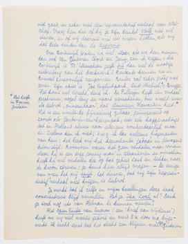 Het Open Einde van Ducroo (een ‘brief aan Wijdenes’) heeft me erg veel moeite gekost en werd 3 × door me bijgewerkt. Ik dacht eerst dat het slecht zou blijven, maar eergisteren zond ik eindelijk de laatste proef (van het laatste vel) terug en bij de definitieve tekst had zoowel Bep als ik het gevoel dat het werkelijk goed geworden was. Ik heb het daarop Pia voorvertaald, die mij zei dat hij het uitstekend vond, en dat hij heelemaal het gevoel had, zonder de rest te kennen (op een paar stukjes na), dat alles hierop uitliep. Dat zou dus ook technisch goed zijn; en het is wèrkelijk een ‘open einde’! Maar volgens Pia is mijn vrees om toch bourgeois te zijn, ongegrond: de bourgeois kan dit alleen afschuwelijk vinden, zei hij, en ofschoon er nergens sprake was van ‘vrijheid’, leek hem mijn standpunt volmaakt anarchistisch. - Hij is verre van idioot, dus hiermee kan rekening worden gehouden.