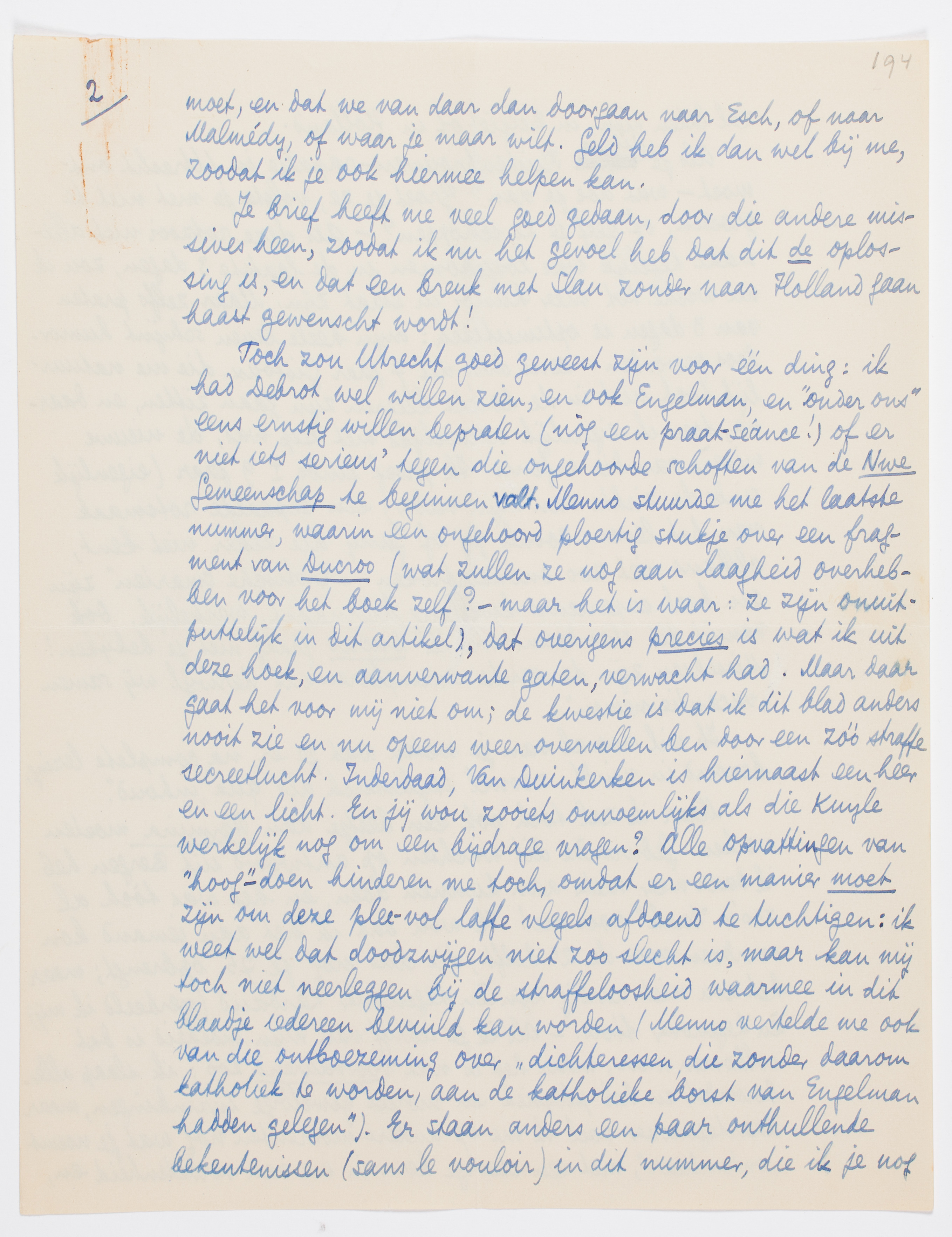 Toch zou Utrecht goed geweest zijn voor één ding: ik had Debrot wel willen zien, en ook Engelman, en ‘onder ons’ eens ernstig willen bepraten (nòg een praat-séance!) of er niet iets serieus' tegen die ongehoorde schoften van de Nwe Gemeenschap te beginnen valt. Menno stuurde me het laatste nummer, waarin een ongehoord ploertig stukje over een fragment van Ducroo3704 (wat zullen ze nog aan laagheid overhebben voor het boek zelf? - maar het is waar: ze zijn onuitputtelijk in dit artikel), dat overigens precies is wat ik uit deze hoek, en aanverwante gaten, verwacht had. Maar daar gaat het voor mij niet om; de kwestie is dat ik dit blad anders nooit zie en nu opeens weer overvallen ben door een zóó straffe secreetlucht. Inderdaad, Van Duinkerken is hiernaast een heer en een licht. En jij wou zooiets onnoemlijks als die Kuyle werkelijk nog om een bijdrage vragen? Alle opvattingen van ‘hoog’-doen hinderen me toch, omdat er een manier moet zijn om deze plee-vol laffe vlegels afdoend te tuchtigen: ik weet wel dat doodzwijgen niet zoo slecht is, maar kan mij toch niet neerleggen bij de straffeloosheid waarmee in dit blaadje iedereen bevuild kan worden (Menno vertelde me ook van die ontboezeming over ‘dichteressen, die zonder daarom katholiek te worden, aan de katholieke borst van Engelman hadden gelegen’).3705 Er staan anders een paar onthullende bekentenissen (sans le vouloir) in dit nummer, die ik je nog zal laten zien, in België of in Holland.
