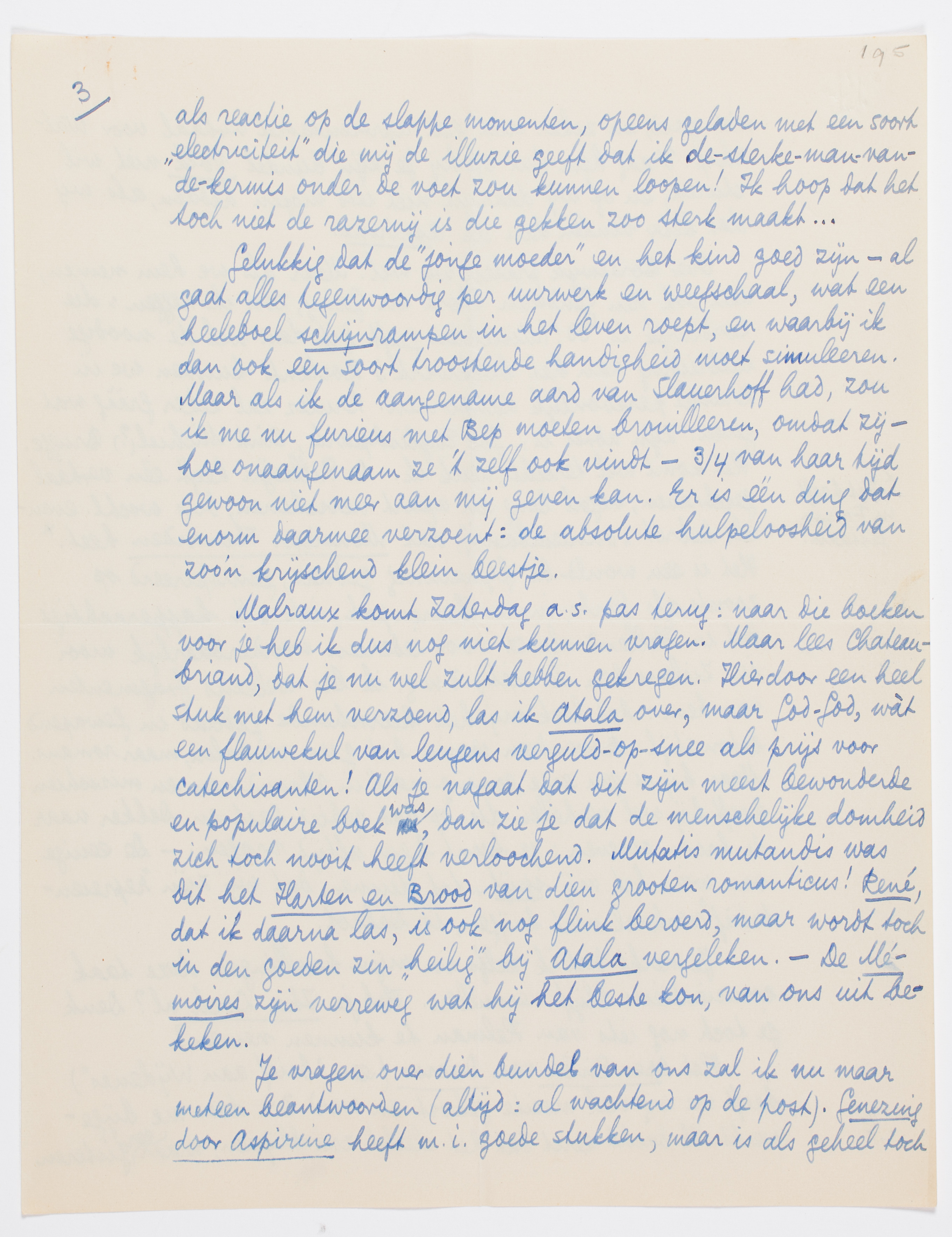 Je vragen over dien bundel van ons zal ik nu maar meteen beantwoorden (altijd: al wachtend op de post). Genezing door Aspirine heeft m.i. goede stukken, maar is als geheel toch niet goed, en zeker niet een representatief verhaal voor Walschap. Vraag hem dus of hij je zijn bundel Volk niet wil sturen, en of wij daaruit niet iets mogen hebben, als wij dat beter vinden dan de Aspirine.