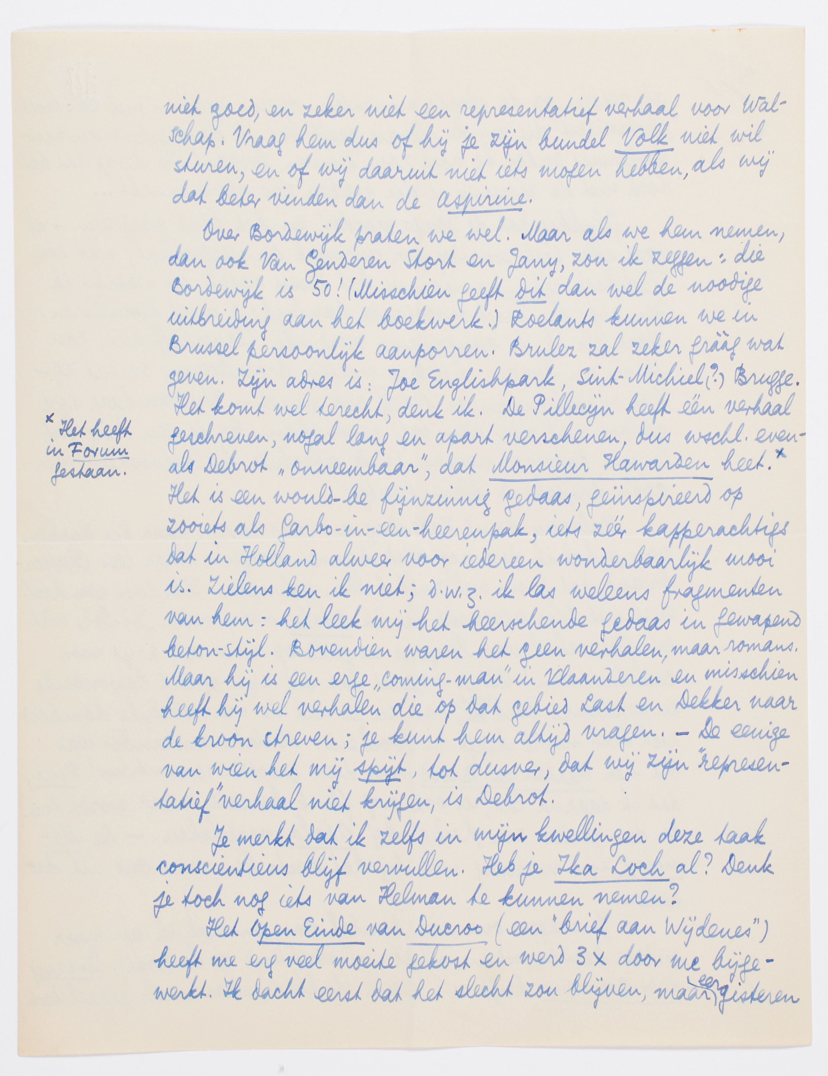 Over Bordewijk praten we wel. Maar als we hem nemen, dan ook Van Genderen Stort en Jany, zou ik zeggen: die Bordewijk is 50! (Misschien geeft dit dan wel de noodige uitbreiding aan het boekwerk.) Roelants kunnen we in Brussel persoonlijk aanporren. Brulez zal zeker grààg wat geven. Zijn adres is: Joe Englishpark, Sint-Michiel(?) Brugge. Het komt wel terecht, denk ik. De Pillecijn heeft één verhaal geschreven, nogal lang en apart verschenen, dus wschl. evenals Debrot ‘onneembaar’, dat Monsieur Hawarden heet.* Het is een would-be fijnzinnig gedaas, geïnspireerd op zooiets als Garbo-in-een-heerenpak, iets zéér kapperachtigs dat in Holland alweer voor iedereen wonderbaarlijk mooi is. Zielens ken ik niet; d.w.z. ik las weleens fragmenten van hem: het leek mij het heerschende gedaas in gewapend beton-stijl. Bovendien waren het geen verhalen, maar romans. Maar hij is een erge ‘coming-man’ in Vlaanderen en misschien heeft hij wel verhalen die op dat gebied Last en Dekker naar de kroon streven; je kunt hem altijd vragen. - De eenige van wien het mij spijt, tot dusver, dat wij zijn ‘representatief’ verhaal niet krijgen, is Debrot.
