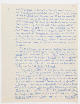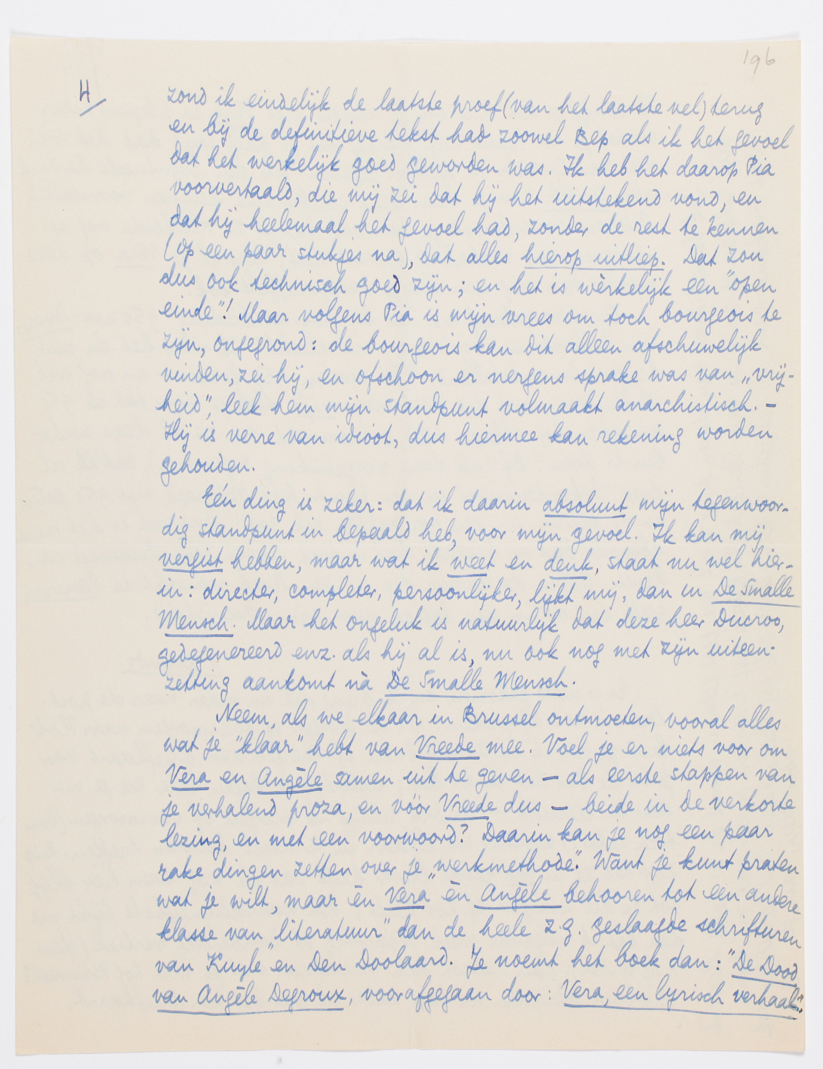 Neem, als we elkaar in Brussel ontmoeten, vooral alles wat je ‘klaar’ hebt van Vreede mee. Voel je er niets voor om Vera en Angèle samen uit te geven. - als eerste stappen van je verhalend proza, en vóór Vreede dus - beide in de verkorte lezing, en met een voorwoord? Daarin kan je nog een paar rake dingen zetten over je ‘werkmethode’. Want je kunt praten wat je wilt, maar èn Vera èn Angèle behooren tot een andere klasse van ‘literatuur’ dan de heele z.g. geslaagde schrifturen van Kuyle en Den Doolaard. Je noemt het boek dan: ‘De Dood van Angèle Degroux, voorafgegaan door: Vera, een lyrisch verhaal’. Ik schrijf je dit niet om je alweer met Vera te plagen, maar omdat je me laatst zelf schreef dat je half spijt had het toch niet aan Querido te hebben gegeven. Bij een eventueele herdruk van Angèle zou je hem deze combinatie kunnen voorstellen. Literair verantwoord je dan ook dat je ze allebeide nog als ‘proeven van verhalend proza’ ziet; terwijl je Vera op deze manier dan nog een beetje ‘wegmoffelt’ ook.