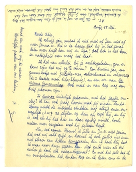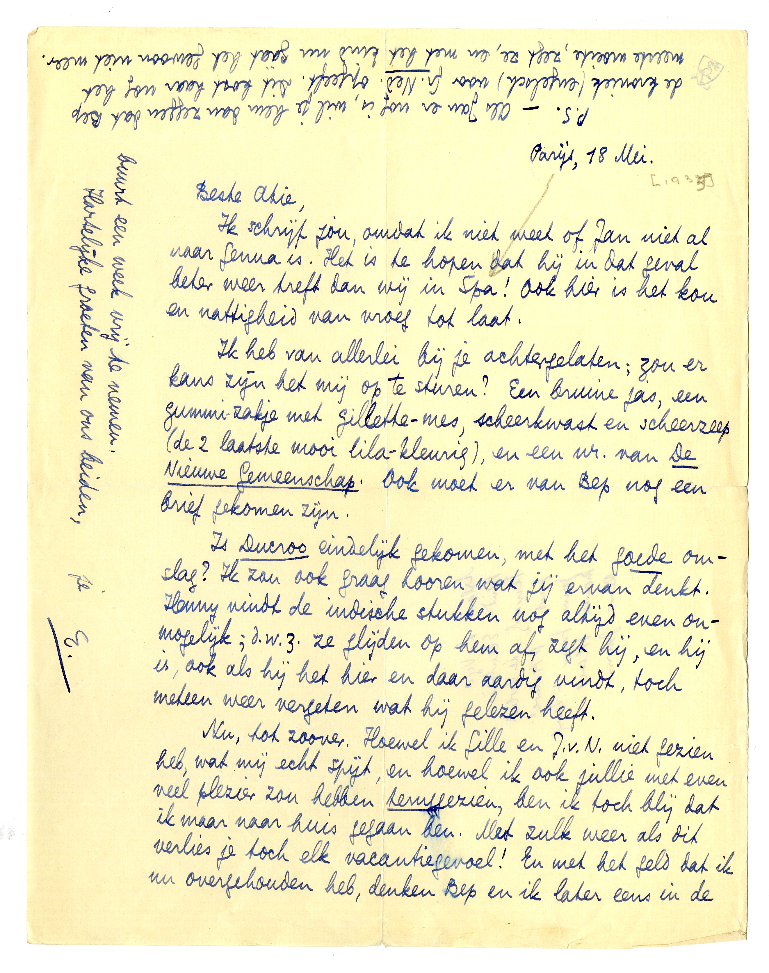 Ik heb van allerlei bij je achtergelaten; zou er kans zijn het mij op te sturen? Een bruine jas, een gummi-zakje met Gillette-mes, scheerkwast en scheerzeep (de laatste 2 mooi lila-kleurig), en een nr. van De Nieuwe Gemeenschap. Ook moet er van Bep nog een brief gekomen zijn.