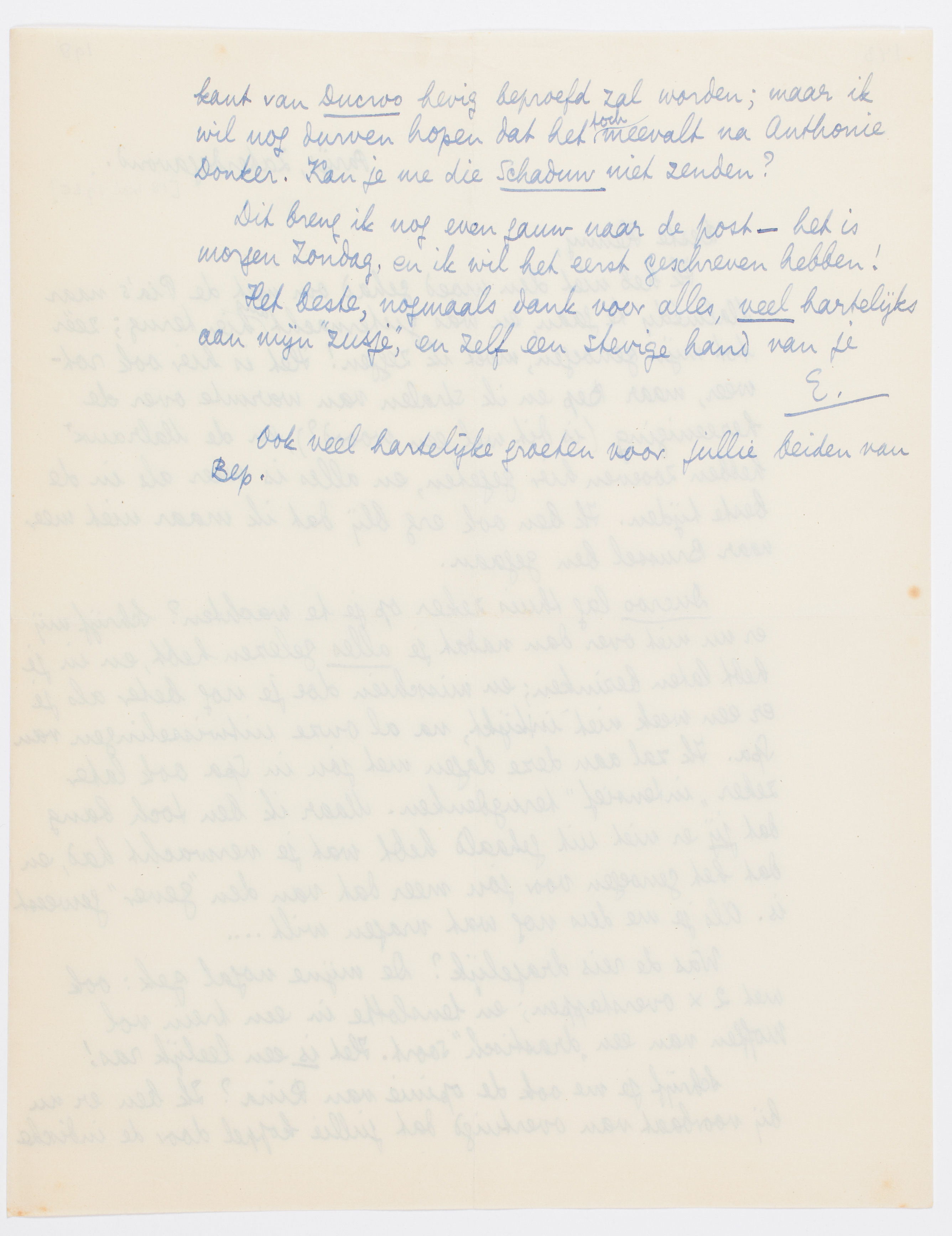 Schrijf je me ook de opinie van Rina? Ik ben er nu bij voorbaat van overtuigd dat jullie koppel door de indische kant van Ducroo hevig beproefd zal worden; maar ik wil nog durven hopen dat het toch meevalt na Anthonie Donker. Kan je me die Schaduw niet zenden?