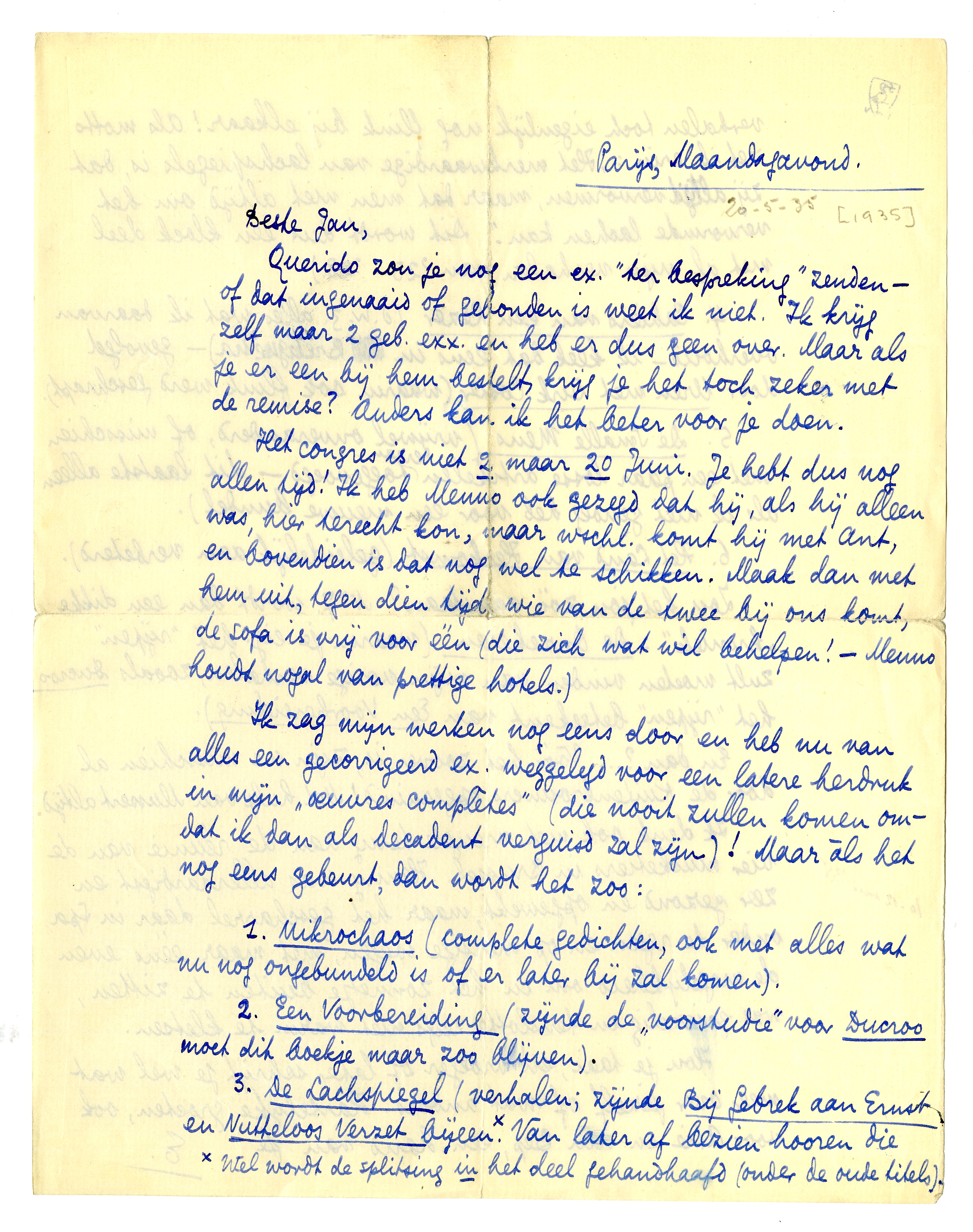 Ik zag mijn werken nog eens door en heb nu van alles een gecorrigeerd ex. weggelegd voor een latere herdruk in mijn ‘oeuvres complètes’ (die nooit zullen komen omdat ik dan als decadent verguisd zal zijn)! Maar àls het nog eens gebeurt, dan wordt het zoo: