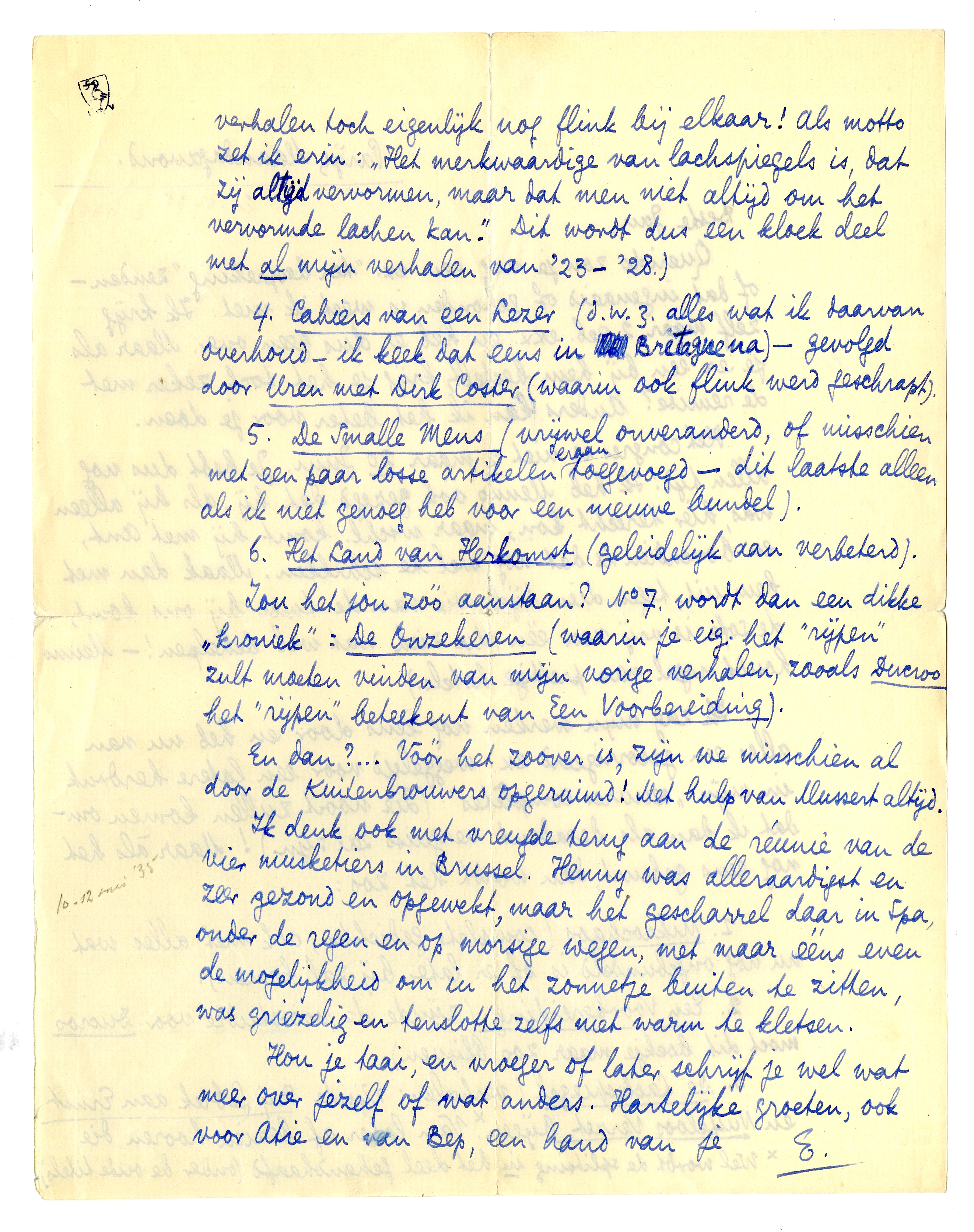 | 4. | Cahiers van een Lezer (d.w.z. alles wat ik daarvan overhoud - ik keek dat eens in Bretagne na) - gevolgd door Uren met Dirk Coster (waarin ook flink werd geschrapt). |