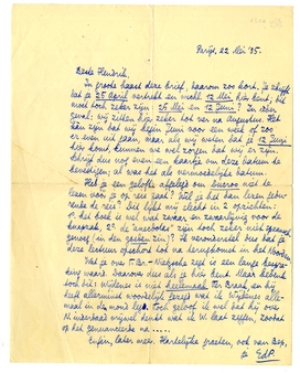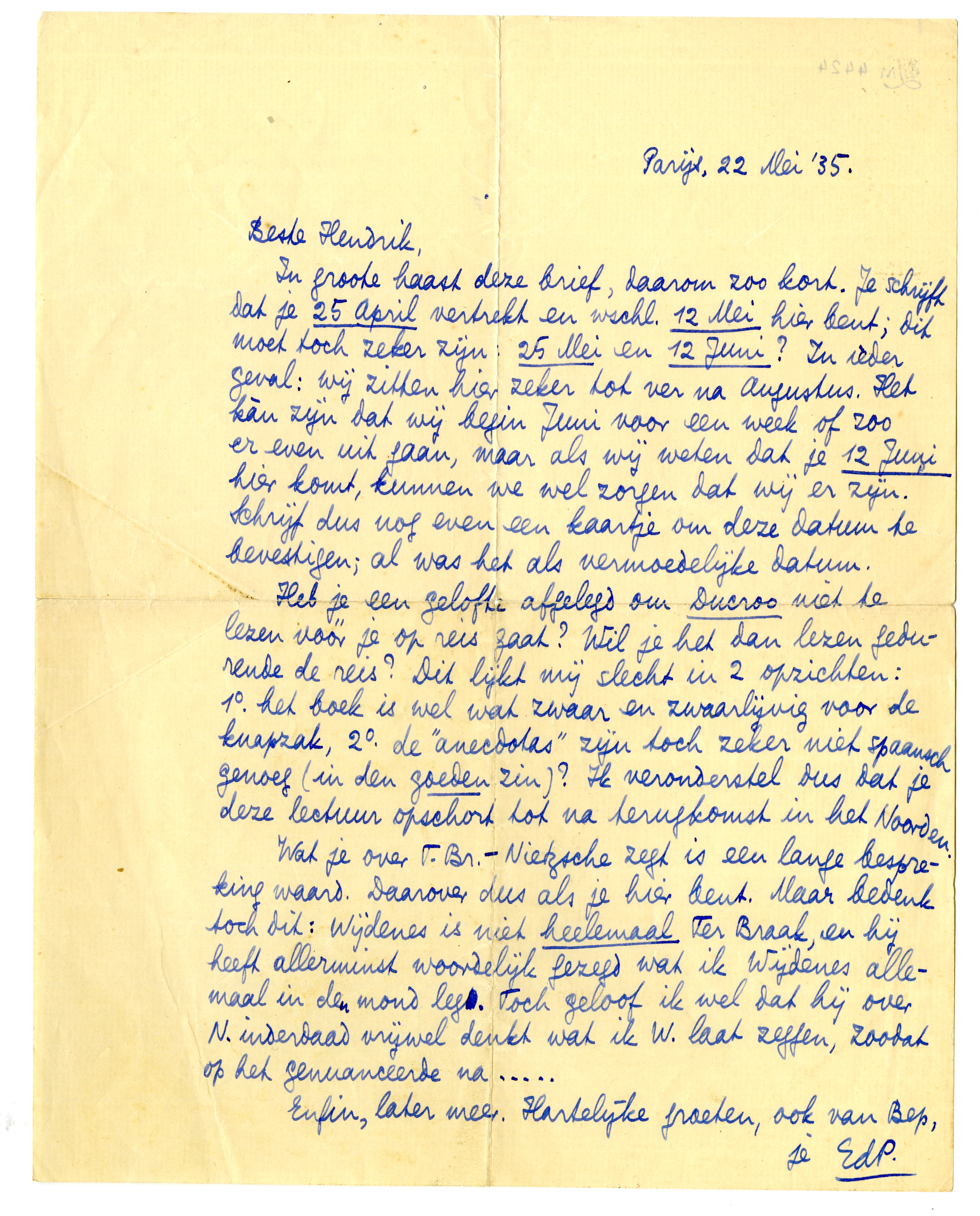 In groote haast deze brief, daarom zoo kort. Je schrijft dat je 25 April vertrekt en wschl. 12 Mei hier bent; dit moet toch zeker zijn: 23 Mei en 12 Juni? In ieder geval: wij zitten hier zeker tot ver na Augustus. Het kàn zijn dat wij begin Juni voor een week of zoo er even uit gaan, maar als wij weten dat je 12 Juni hier komt, kunnen we wel zorgen dat wij er zijn. Schrijf dus nog even een kaartje om deze datum te bevestigen; al was het als vermoedelijke datum.