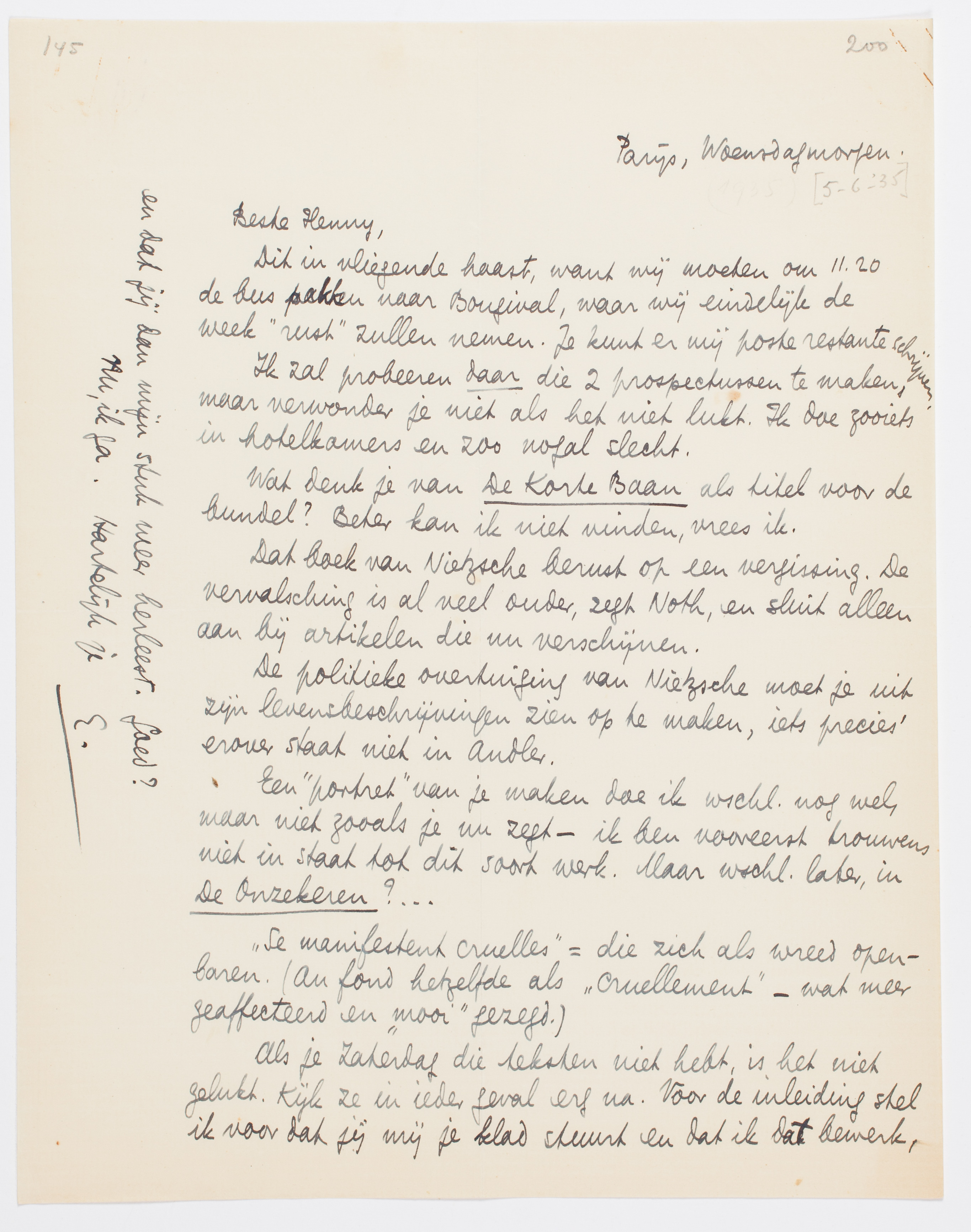 Een ‘portret’ van je maken doe ik wschl. nog wel, maar niet zooals je nu zegt - ik ben vooreerst trouwens niet in staat tot dit soort werk.3746 Maar wschl. later, in De Onzekeren?...3747