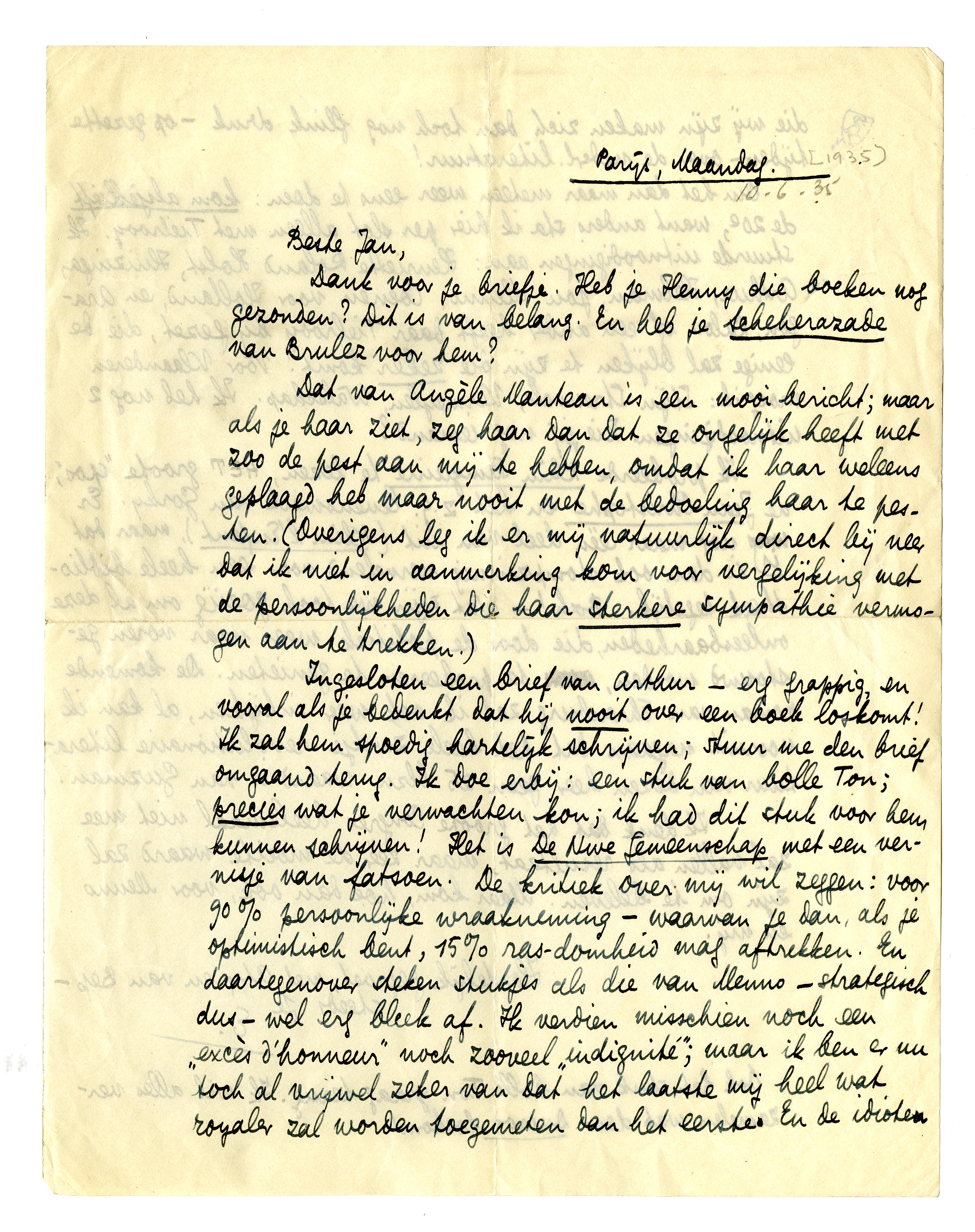 Ingesloten een brief van Arthur - erg grappig, en vooral als je bedenkt dat hij nooit over een boek loskomt! Ik zal hem spoedig hartelijk schrijven; stuur me den brief omgaand terug. Ik doe erbij: een stuk van bolle Ton; precies wat je verwachten kon; ik had dit stuk voor hem kunnen schrijven! Het is De Nwe Gemeenschap met een vernisje van fatsoen. De kritiek over mij wil zeggen: voor 90% persoonlijke wraakneming - waarvan je dan, als je optimistisch bent, 15% ras-domheid mag aftrekken. En daartegenover steken stukjes als die van Menno - strategisch dus - wel erg bleek af. Ik verdien misschien noch een ‘excès d'honneur’ noch zooveel ‘indignité’3752; maar ik ben er nu toch al vrijwel zeker van dat het laatste mij heel wat royaler zal worden toegemeten dan het eerste. En de idioten die wij zijn maken zich toch dan nog flink druk - op gezette tijden - over de nederl. literatuur!