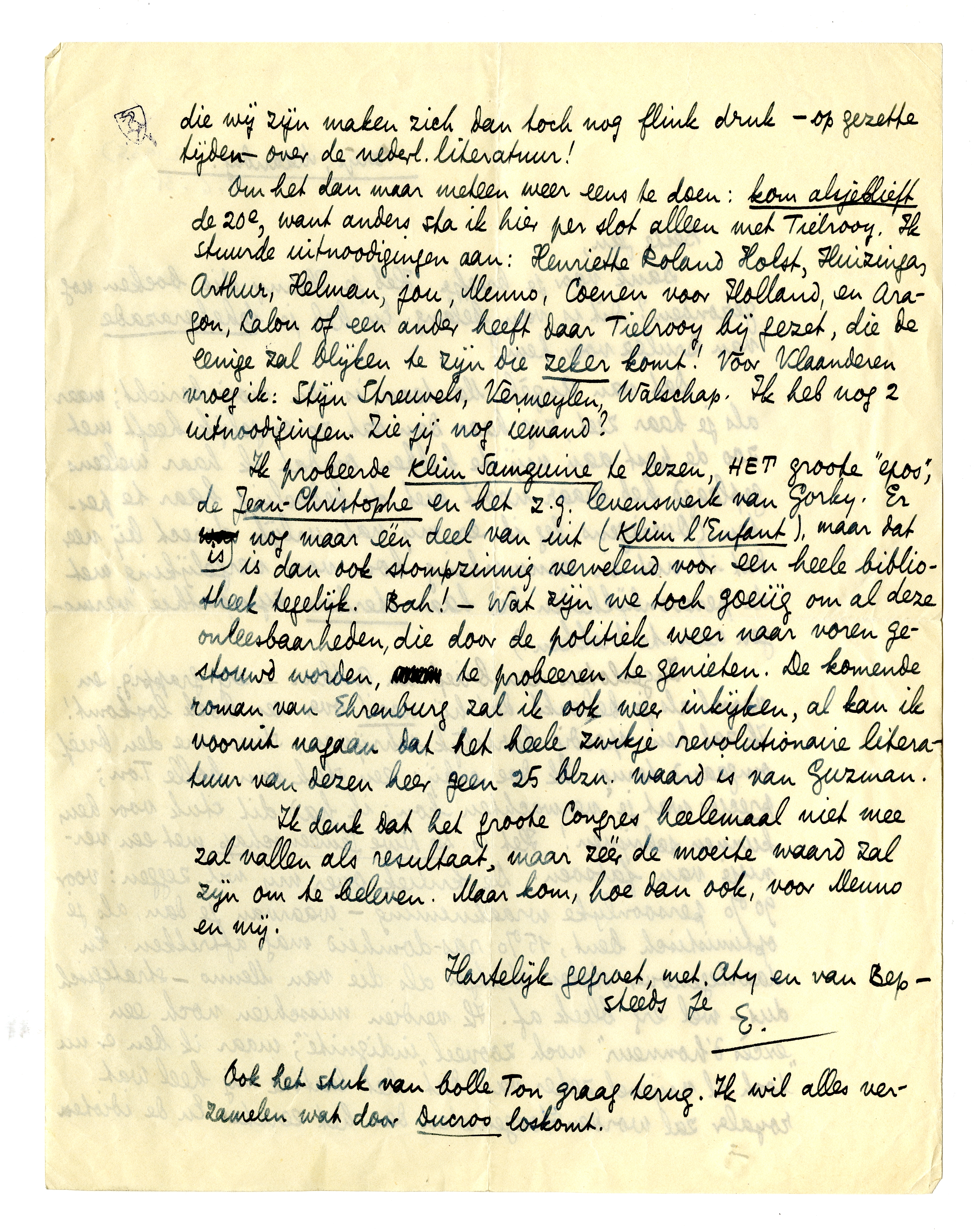 Om het dan maar meteen weer eens te doen: kom alsjeblieft de 20e, want anders sta ik hier per slot alleen met Tielrooy.3753 Ik stuurde uitnoodigingen aan: Henriette Roland Holst, Huizinga, Arthur, Helman, jou, Menno, Coenen voor Holland, en Aragon, Lalou of een ander heeft daar Tielrooy bij gezet, die de eenige zal blijken te zijn die zeker komt! Voor Vlaanderen vroeg ik: Stijn Streu veis, Vermeijlen, Walschap. Ik heb nu nog 2 uitnoodigingen. Zie jij nog iemand?