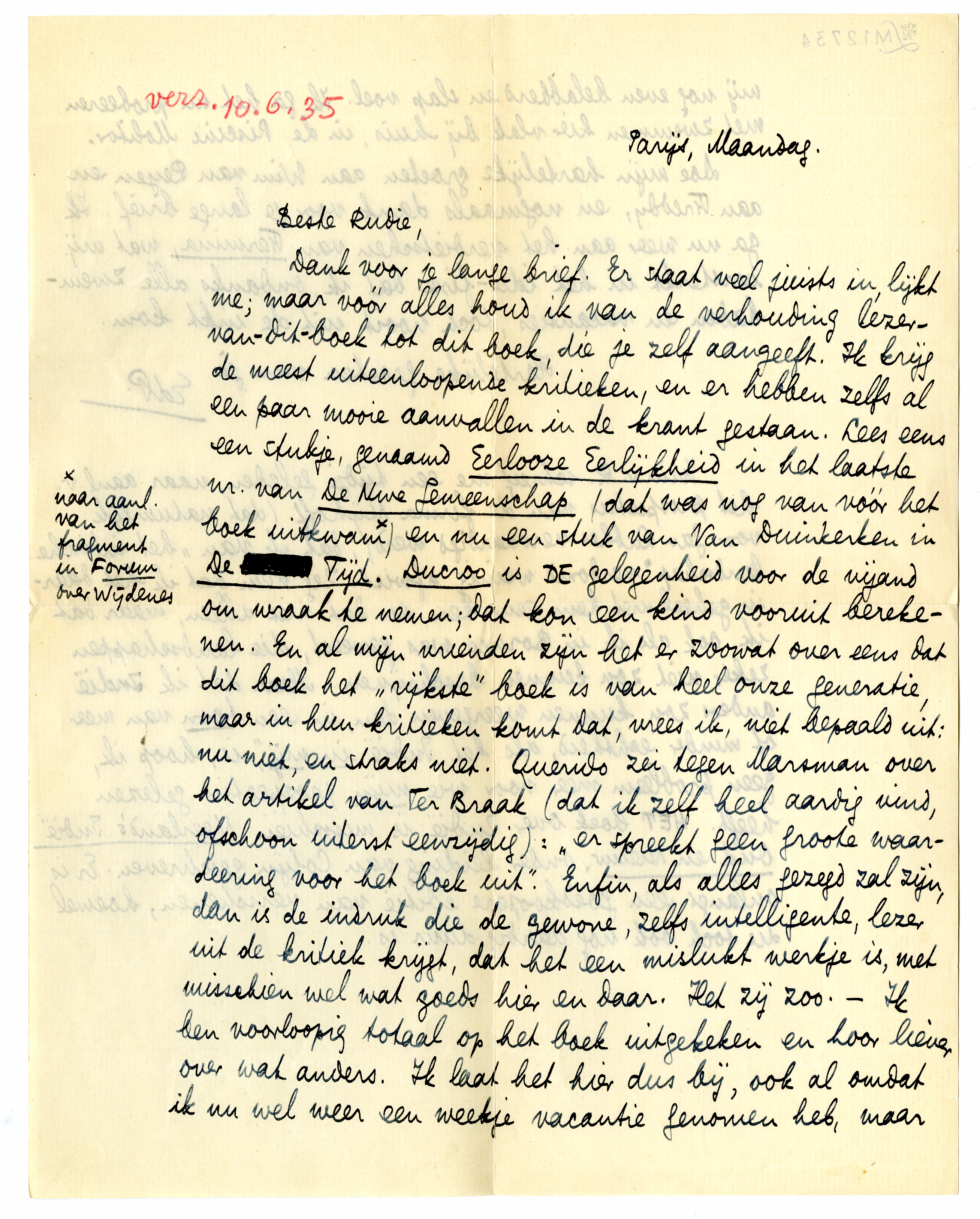 Dank voor je lange brief. Er staat veel juists in, lijkt me; maar vóór alles houd ik van de verhouding lezer-van-dit-boek tot dit boek, die je zelf aangeeft. Ik krijg de meest uiteenloopende kritieken, en er hebben zelfs al een paar mooie aanvallen in de krant gestaan. Lees eens een stukje, genaamd Eerloze Eerlijkheid in het laatste nr. van De Nwe Gemeenschap (dat was nog van vóór het boek uitkwam*) en nu een stuk van Van Duinkerken in De Tijd. Ducroo is DE gelegenheid voor de vijand om wraak te nemen; dat kon een kind vooruit berekenen. En al mijn vrienden zijn het er zoowat over eens dat dit boek het ‘rijkste’ boek is van heel onze generatie, maar in hun kritieken komt dat, vrees ik, niet bepaald uit: nu niet, en straks niet. Querido zei tegen Marsman over het artikel van Ter Braak (dat ik zelf heel aardig vind, ofschoon uiterst eenzijdig): ‘er spreekt geen groote waardeering voor het boek uit’. Enfin, als alles gezegd zal zijn, dan is de indruk die de gewone, zelfs intelligente, lezer uit de kritiek krijgt, dat het een mislukt werkje is, met misschien wel wat goeds hier en daar. Het zij zoo. - Ik ben voorloopig totaal op het boek uitgekeken en hoor liever over wat anders. Ik laat het hier dus bij, ook al omdat ik nu wel weer een weekje vacantie genomen heb, maar mij nog even belabberd en slap voel. Ik ga het nu probeeren met zwemmen hier vlak bij huis, in de Piscine Molitor.