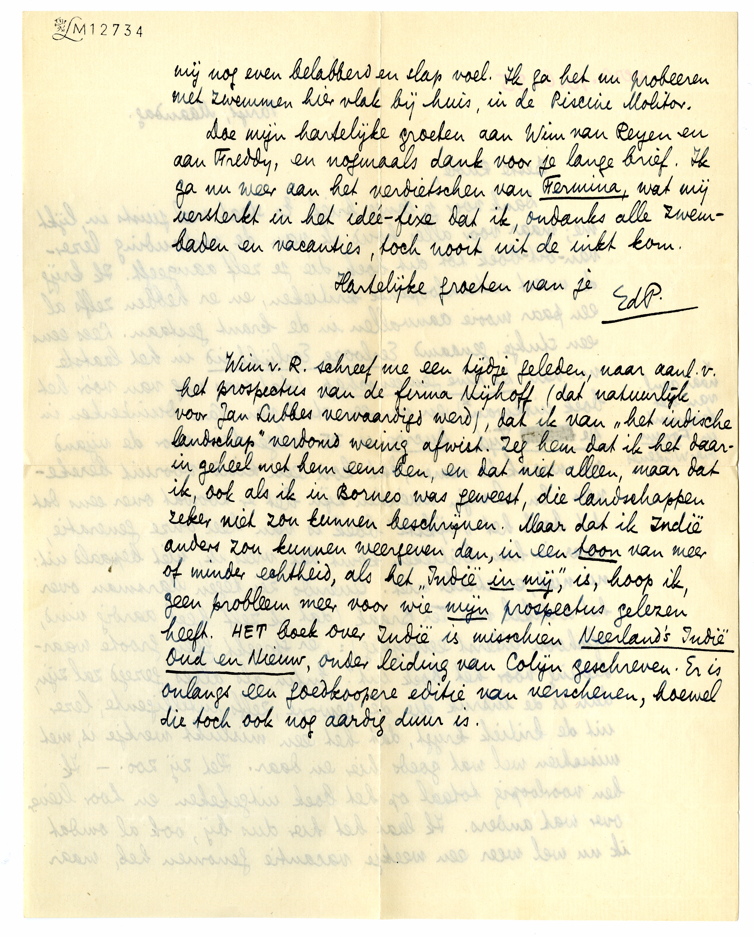 Wim v.R. schreef me een tijdje geleden, naar aanl. v. het prospectus van de firma Nijhoff (dat natuurlijk voor Jan Lubbes vervaardigd werd), dat ik van ‘het indische landschap’ verdomd weinig afwist. Zeg hem dat ik het daarin geheel met hem eens ben, en dat niet alleen, maar dat ik, ook als ik in Borneo was geweest, die landschappen zeker niet zou kunnen beschrijven. Maar dat ik Indië anders zou kunnen weergeven dan, in een toon van meer of minder echtheid, als het ‘Indië in mij’, is, hoop ik, geen probleem meer voor wie mijn prospectus gelezen heeft. HET boek over Indië is misschien Neerland's Indië Oud en Nieuw, onder leiding van Colijn geschreven.3757 Er is onlangs een goedkoopere editie van verschenen, hoewel die toch ook nog aardig duur is.