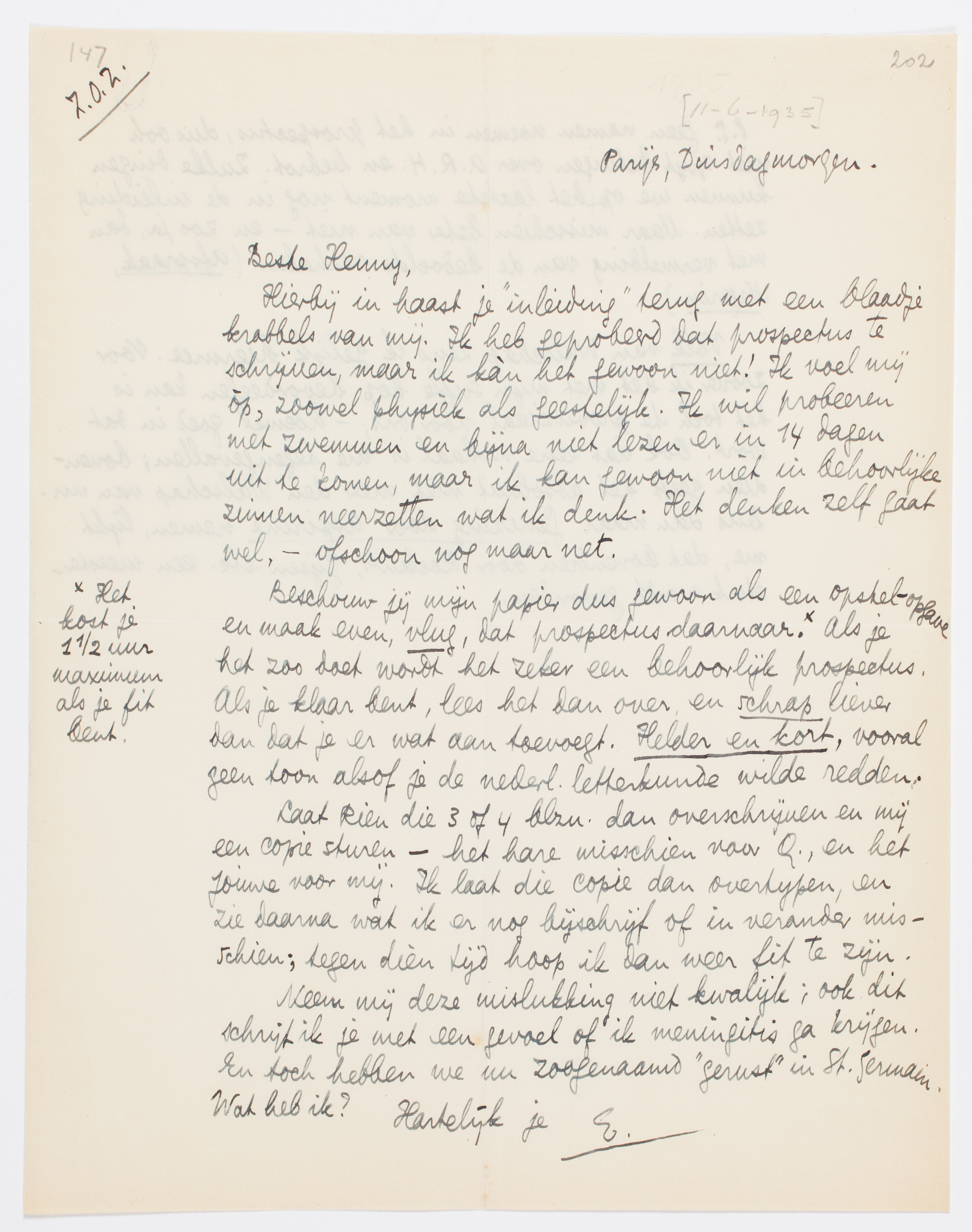 Hierbij in haast je ‘inleiding’ terug met een blaadje krabbels van mij. Ik heb geprobeerd dat prospectus te schrijven, maar ik kàn het gewoon niet! Ik voel mij òp, zoowel physiek als geestelijk. Ik wil probeeren met zwemmen en bijna niet lezen er in 14 dagen uit te komen, maar ik kan gewoon niet in behoorlijke zinnen neerzetten wat ik denk. Het denken zelf gaat wel, - ofschoon nog maar net.