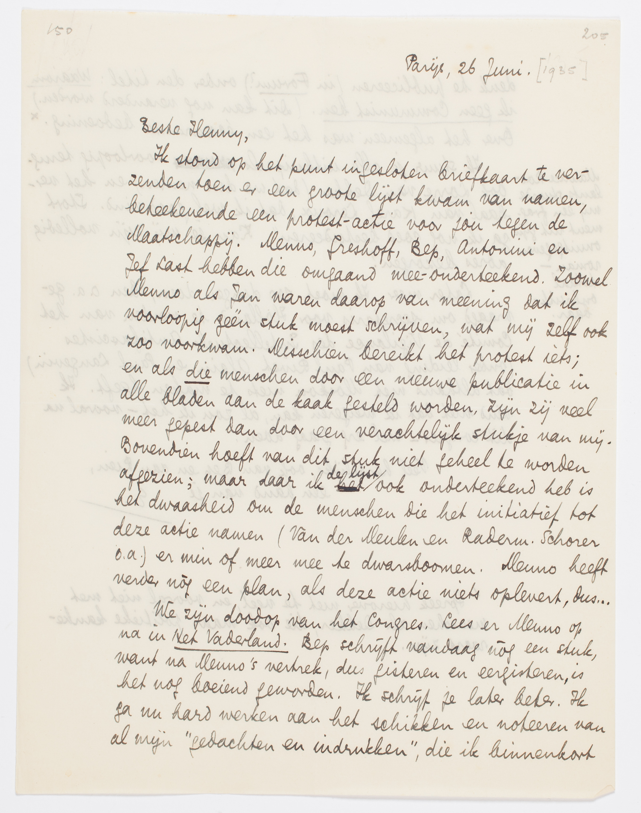 Ik stond op het punt ingesloten briefkaart3781 te verzenden toen er een groote lijst kwam van namen, beteekenende een protest-actie voor jou tegen de Maatschappij. Menno, Greshoff, Bep, Antonini en Jef Last hebben die omgaand mee-onderteekend. Zoowel Menno als Jan waren daarop van meening dat ik voorloopig géén stuk moest schrijven, wat mij zelf ook zoo voorkwam. Misschien bereikt het protest iets; en als die menschen door een nieuwe publicatie in alle bladen aan de kaak gesteld worden, zijn zij veel meer gepest dan door een verachtelijk stukje van mij. Bovendien hoeft van dit stuk niet geheel te worden afgezien; maar daar ik de lijst ook onderteekend heb is het dwaasheid om de menschen die het initiatief tot deze actie namen (Van der Meulen en Raderm. Schorer o.a.) er min of meer mee te dwarsboomen. Menno heeft verder nòg een plan, als deze actie3782 niets oplevert, dus...