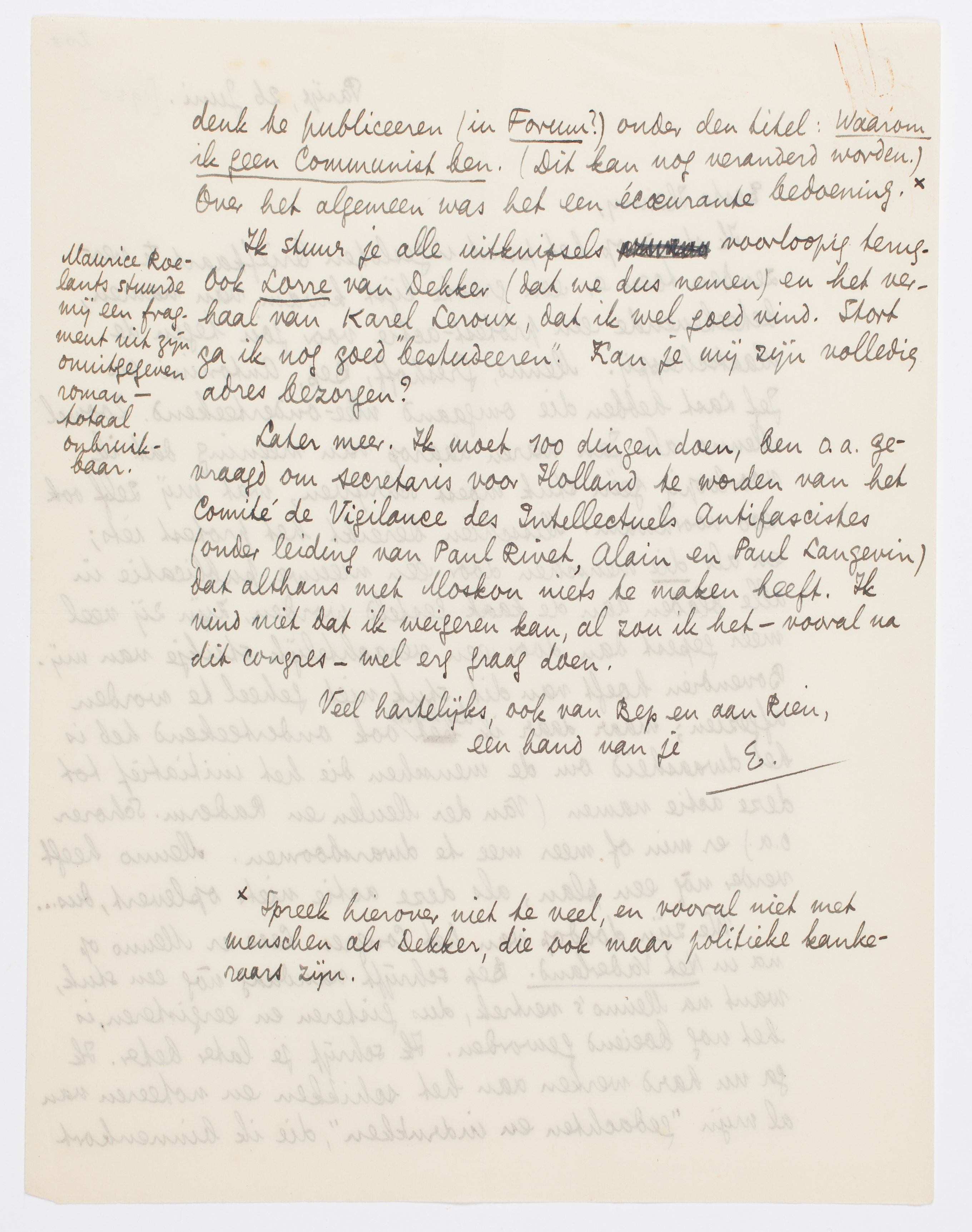 Later meer. Ik moet 100 dingen doen, ben o.a. gevraagd om secretaris voor Holland te worden van het Comité de Vigilance des Intellectuels Antifascistes3787 (onder leiding van Paul Rivet, Alain en Paul Langevin) dat althans met Moskou niets te maken heeft. Ik vind niet dat ik weigeren kan, al zou ik het - vooral na dit congres - wel erg graag doen.