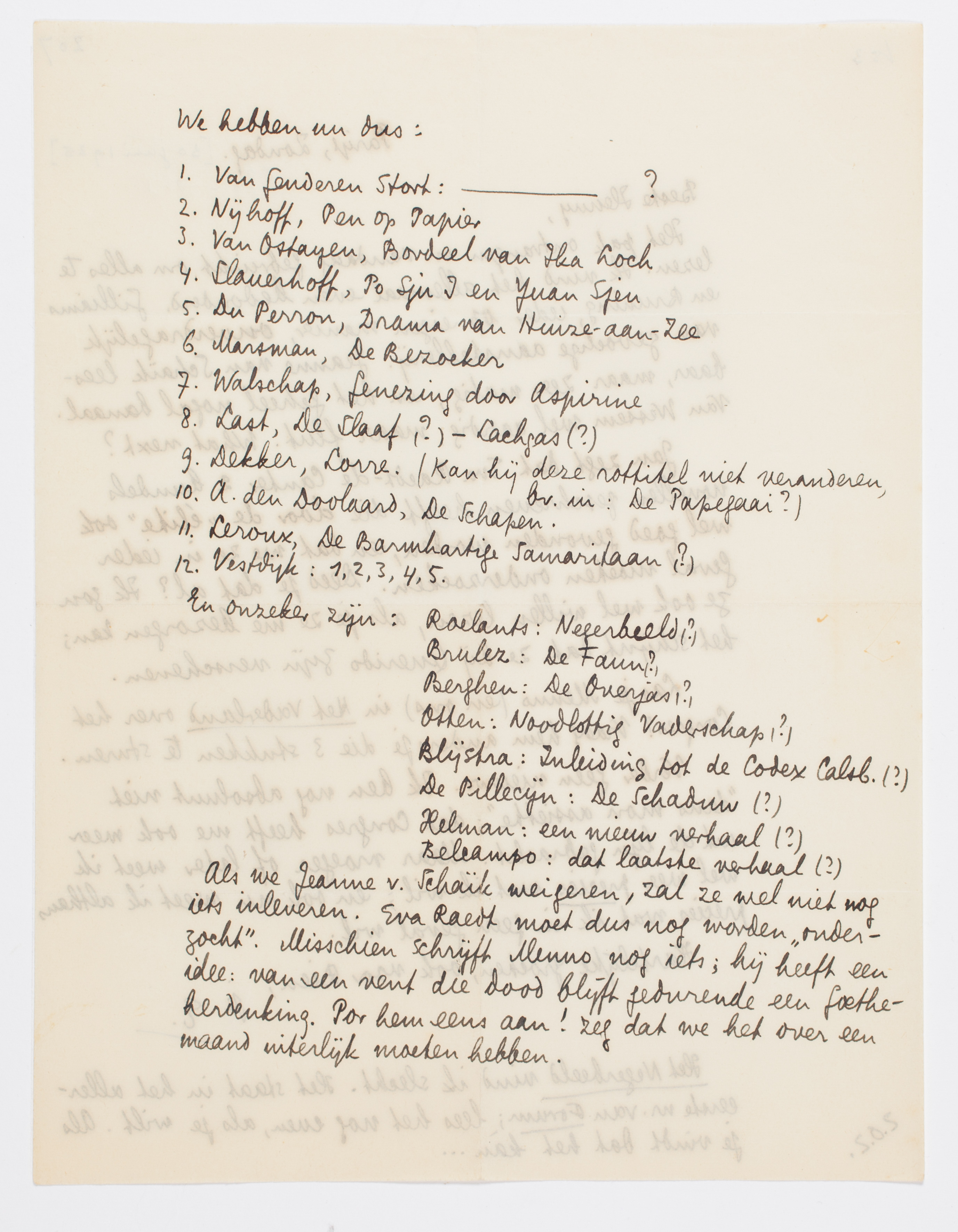 Als we Jeanne v. Schaïk weigeren, zal ze wel niet nog iets inleveren. Eva Raedt moet dus nog worden ‘onderzocht’. Misschien schrijft Menno nog iets; hij heeft een idee: van een vent die dood blijft gedurende een Goethe-herdenking. Por hem eens aan! zeg dat we het over een maand uiterlijk moeten hebben.