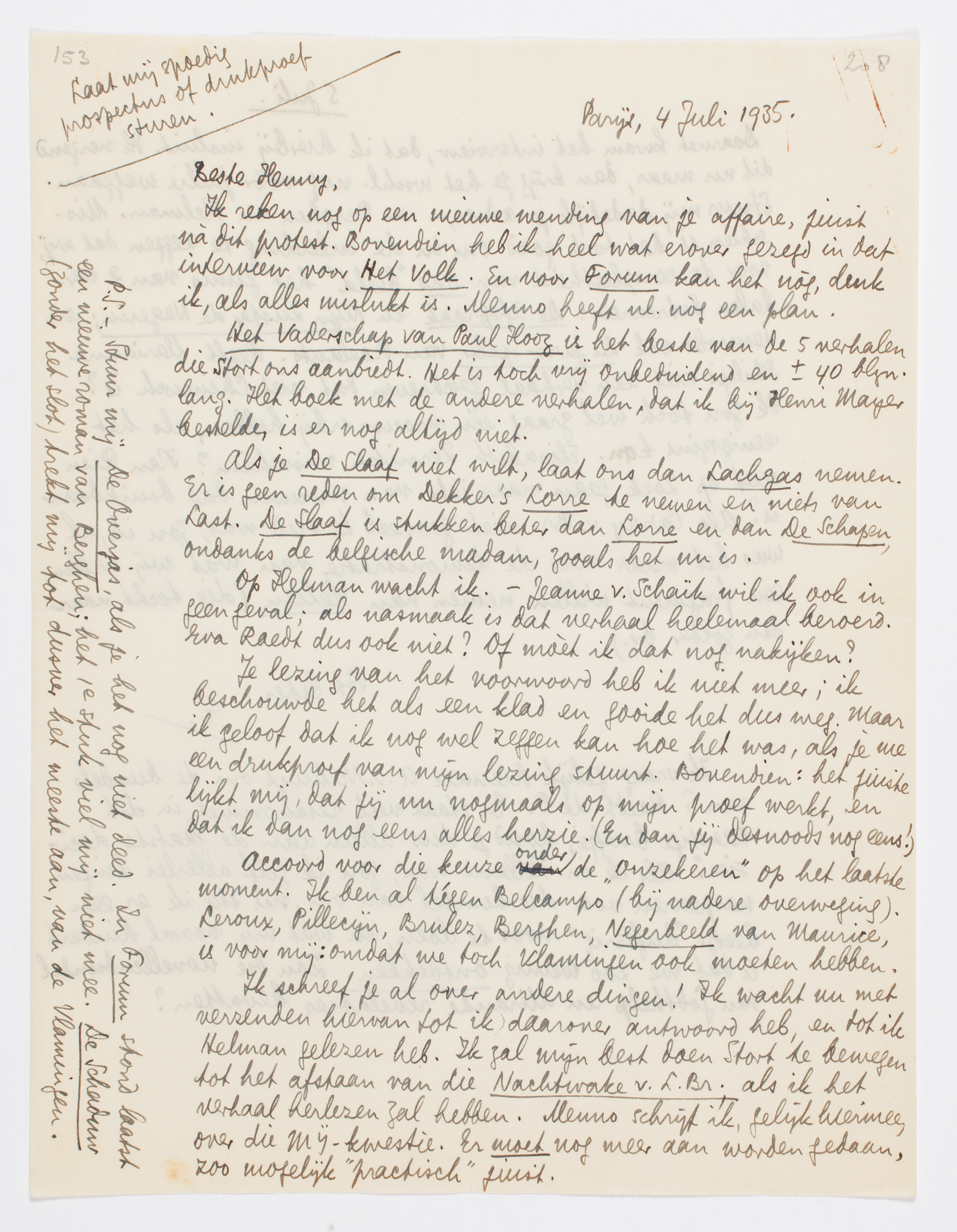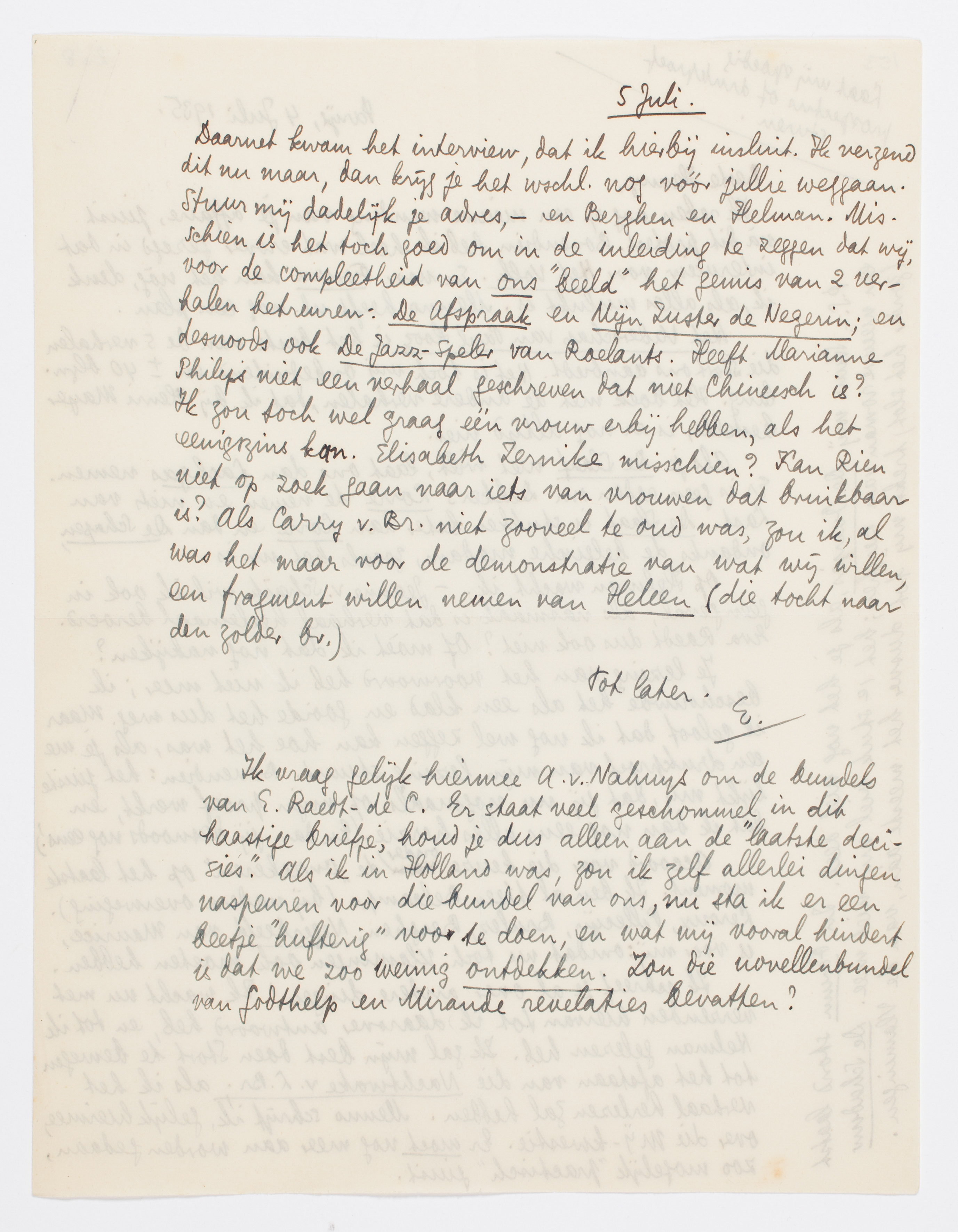 Daarnet kwam het interview, dat ik hierbij insluit. Ik verzend dit nu maar, dan krijg je het wschl. nog vóór jullie weggaan. Stuur mij dadelijk je adres, - en Berghen en Helman. Misschien is het toch goed om in de inleiding te zeggen dat wij, voor de compleetheid van ons ‘beeld’ het gemis van 2 verhalen betreuren: De Afspraak en Mijn Zuster de Negerin; en desnoods ook De Jazz-Speler van Roelants. Heeft Marianne Philips niet een verhaal geschreven dat niet Chineesch is? Ik zou toch wel graag één vrouw erbij hebben, als het ee-nigszins kan. Elisabeth Zernike misschien? Kan Rien niet op zoek gaan naar iets van vrouwen dat bruikbaar is? Als Carry v. Br. niet zooveel te oud was, zou ik, al was het maar voor de demonstratie van wat wij willen, een fragment willen nemen van Heleen (die tocht naar den zolder bv.)