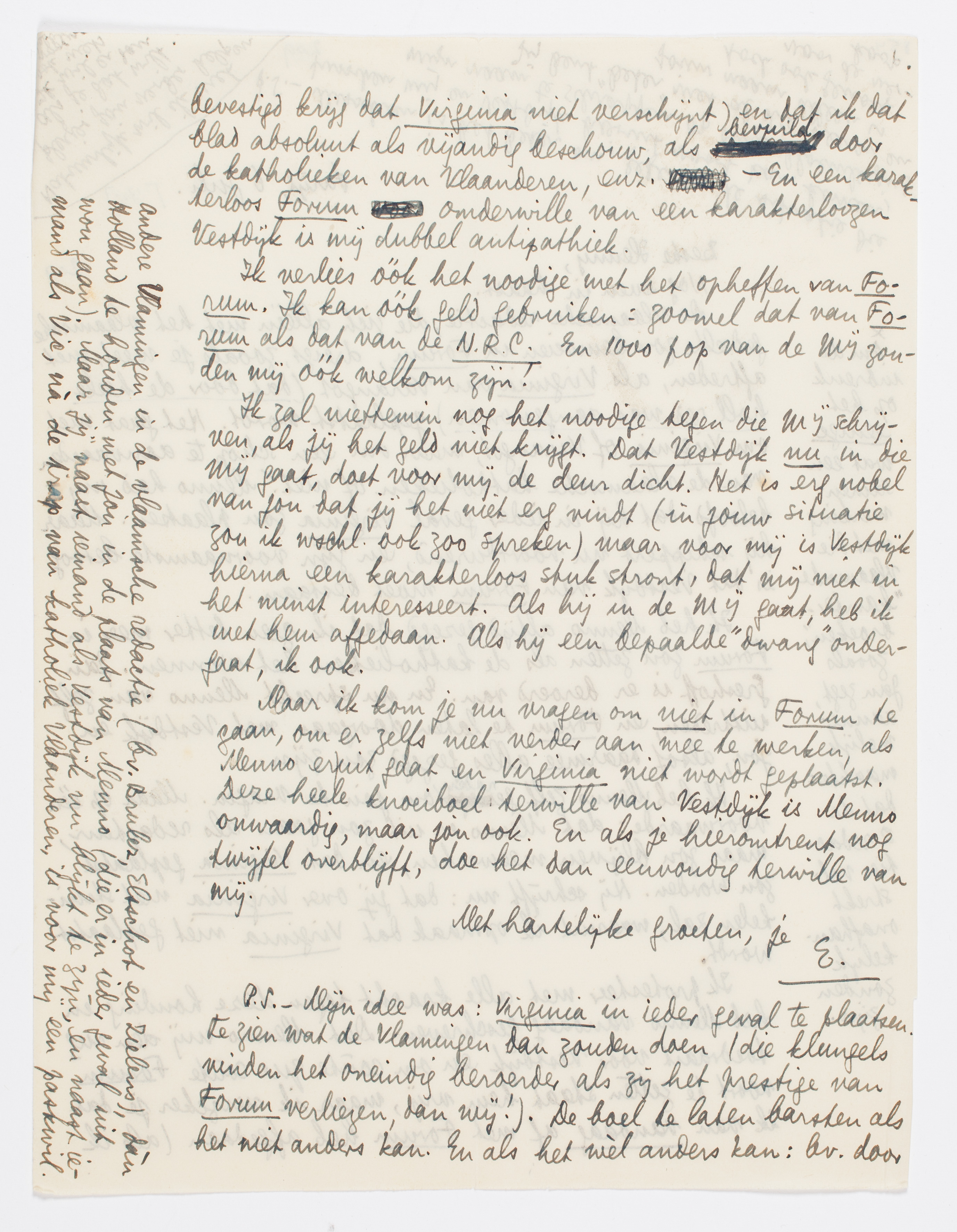 P.S. - Mijn idee was: Virginia in ieder geval te plaatsen. Te zien wat de Vlamingen dan zouden doen (die klungels vinden het oneindig beroerder als zij het prestige van Forum verliezen, dan wij!). De boel te laten barsten als het niet anders kan. En als het wèl anders kan: bv. door andere Vlamingen in de vlaamsche redactie (bv. Brulez, Elsschot en Zielens), dàn Holland te houden met jou in de plaats van Menno (die er in ieder geval uit wou gaan). Maar jij naast iemand als Vestdijk nu blijkt te zijn, en naast iemand als Vic, nà de trap van katholiek Vlaanderen, is voor mij een paskwil.