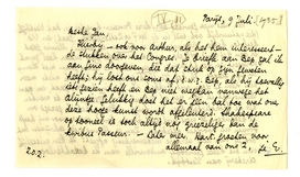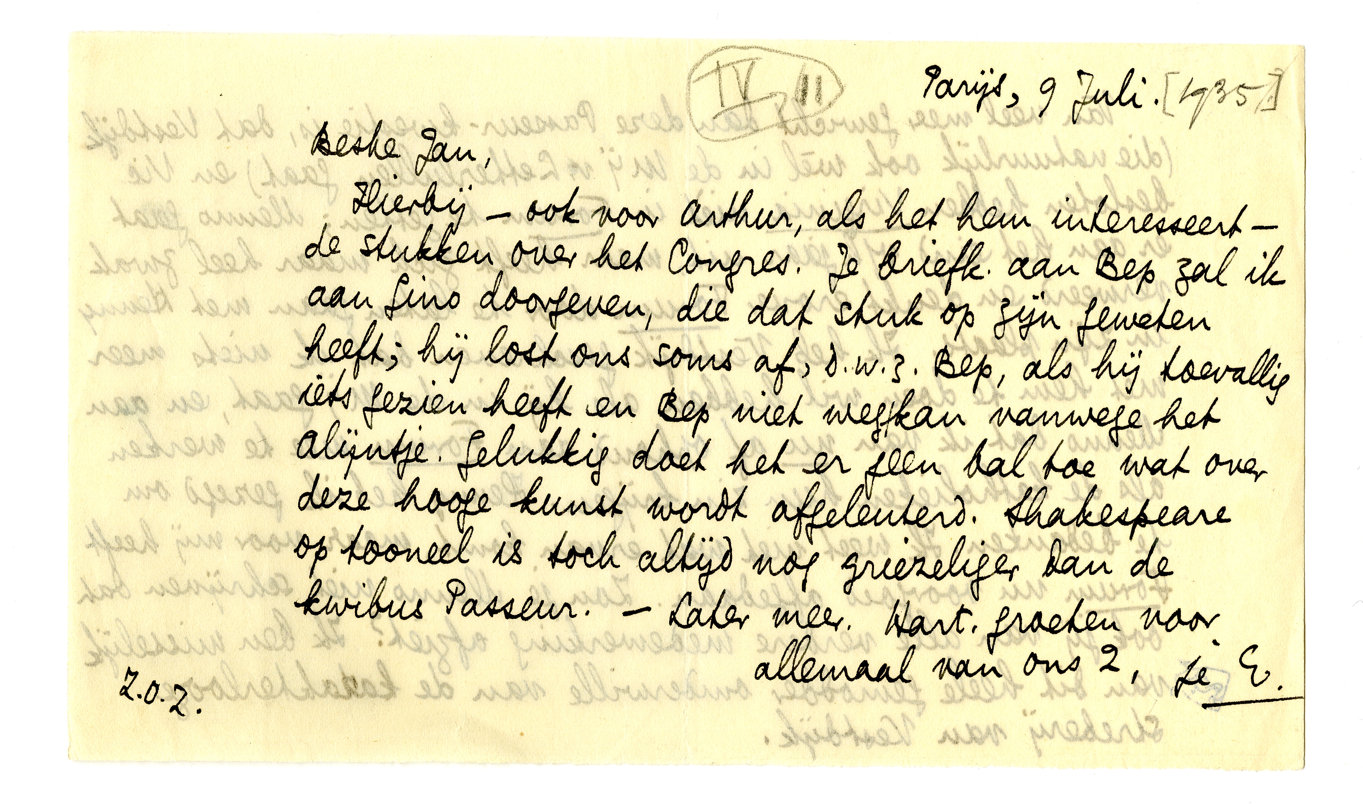 Hierbij - ook voor Arthur, als het hem interesseert - de stukken over het Congres. Je briefk. aan Bep zal ik aan Gino doorgeven, die dat stuk op zijn geweten heeft; hij lost ons soms af, d.w.z. Bep, als hij toevallig iets gezien heeft en Bep niet weg kan vanwege het Alijntje. Gelukkig doet het er geen bal toe wat over deze hooge kunst wordt afgeleuterd. Shakespeare op tooneel is toch altijd nog griezeliger dan de kwibus Passeur.3806 - Later meer. Hart. groeten voor allemaal van ons 2,