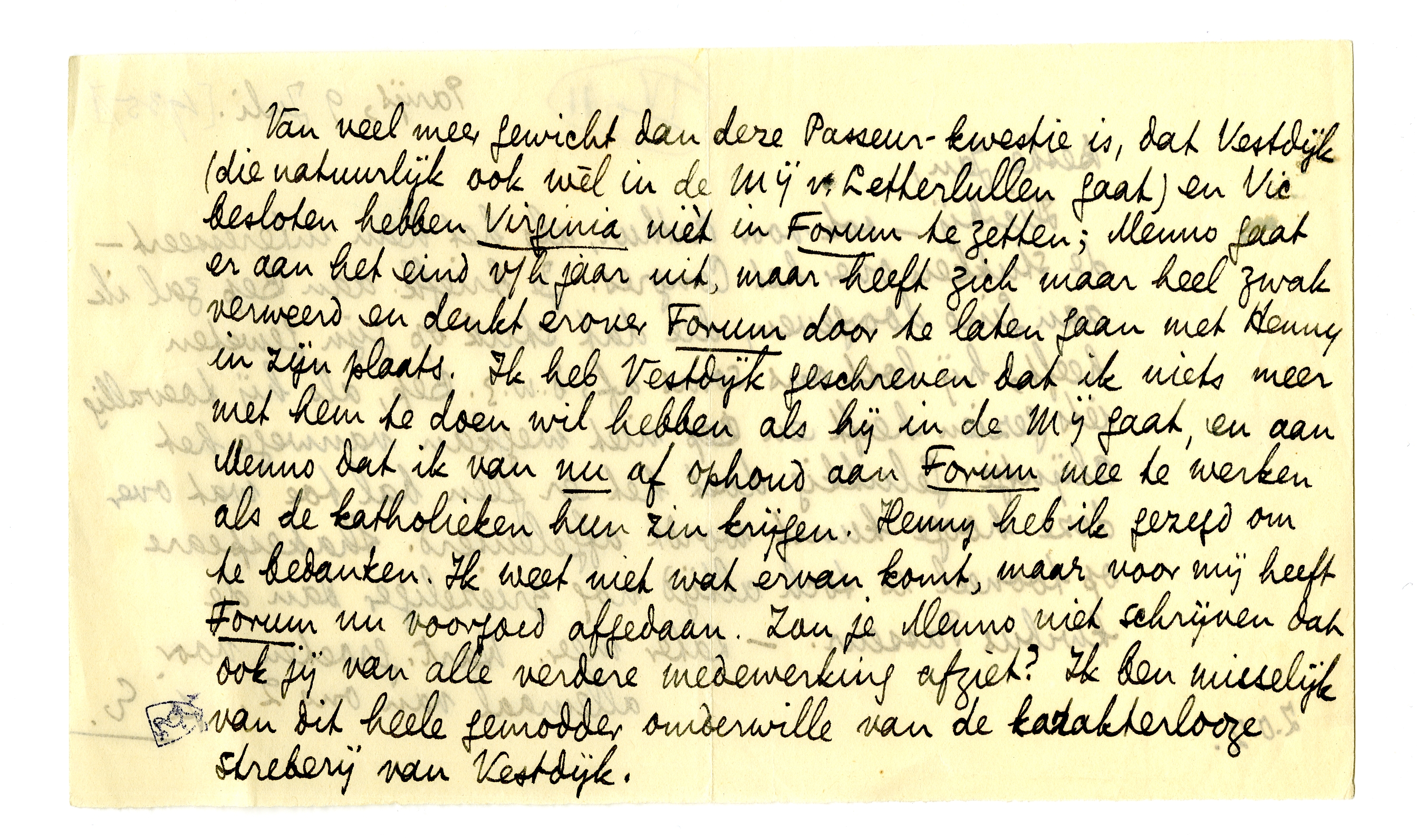 Van veel meer gewicht dan deze Passeur-kwestie is, dat Vestdijk (die natuurlijk ook wèl in de Mij v. Letterlullen gaat) en Vic besloten hebben Virginia nièt in Forum te zetten; Menno gaat er aan het eind v/h jaar uit, maar heeft zich maar heel zwak verweerd en denkt erover Forum door te laten gaan met Henny in zijn plaats. Ik heb Vestdijk geschreven dat ik niets meer met hem te doen wil hebben als hij in de Mij gaat, en aan Menno dat ik van nu af ophoud aan Forum mee te werken als de katholieken hun zin krijgen. Henny heb ik gezegd om te bedanken. Ik weet niet wat ervan komt, maar voor mij heeft Forum nu voorgoed afgedaan. Zou je Menno niet schrijven dat ook jij van alle verdere medewerking afziet? Ik ben misselijk van dit heele gemodder omderwille van de karakterlooze streberij van Vestdijk.
