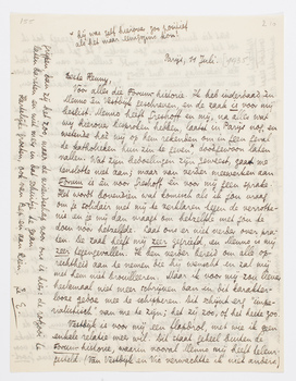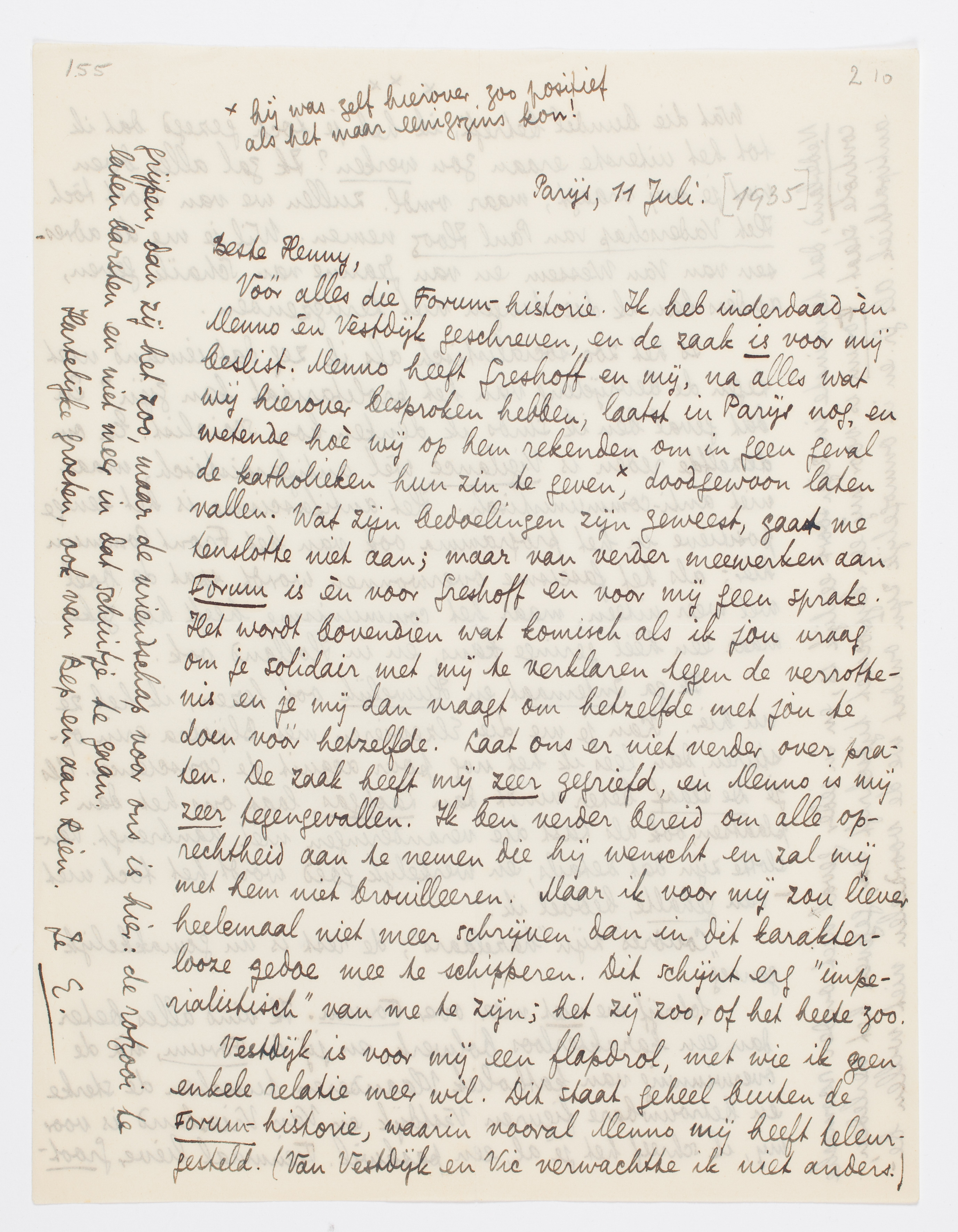 Vóór alles die Forum-historie. Ik heb inderdaad èn Menno èn Vestdijk geschreven, en de zaak is voor mij beslist. Menno heeft Greshoff en mij, na alles wat wij hierover besproken hebben, laatst in Parijs nog, en wetende hoè wij op hem rekenden om in geen geval de katholieken hun zin te geven,* doodgewoon laten vallen. Wat zijn bedoelingen zijn geweest, gaat me tenslotte niet aan; maar van verder meewerken aan Forum is èn voor Greshoff èn voor mij geen sprake. Het wordt bovendien wat komisch als ik jou vraag om je solidair met mij te verklaren tegen de verrottenis en je mij dan vraagt om hetzelfde met jou te doen vóór hetzelfde. Laat ons er niet verder over praten. De zaak heeft mij zeer gegriefd, en Menno is mij zeer tegengevallen. Ik ben verder bereid om alle oprechtheid aan te nemen die hij wenscht en zal mij met hem niet brouilleeren. Maar ik voor mij zou liever heelemaal niet meer schrijven dan in dit karakterlooze gedoe mee te schipperen. Dit schijnt erg ‘imperialistisch’ van me te zijn; het zij zoo, of het heete zoo.
