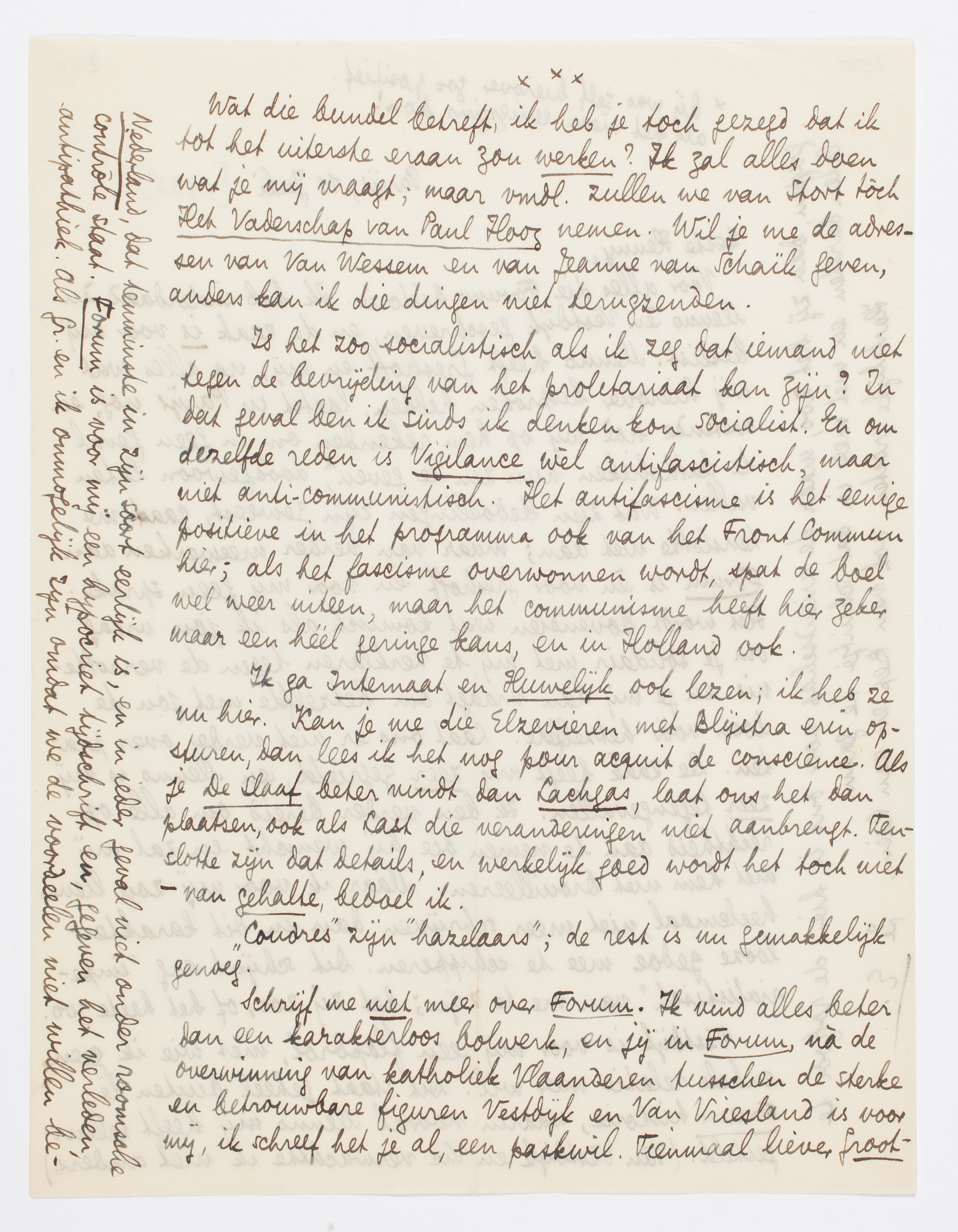 Schrijf me niet meer over Forum. Ik vind alles beter dan een karakterloos bolwerk, en jij in Forum, nà de overwinning van katholiek Vlaanderen tusschen de sterke en betrouwbare figuren Vestdijk en Van Vriesland is voor mij, ik schreef het je al, een paskwil. Tienmaal liever Groot-Nederland, dat tenminste in zijn soort eerlijk is en in ieder geval niet onder roomsche contrôle staat. Forum is voor mij een hypocriet tijdschrift en, gegeven het verleden, antipathiek. Als Gr. en ik onmogelijk zijn omdat we de voordeelen niet willen begrijpen, dan zij het zoo, maar de vriendschap voor ons is hier: de rotzooi te laten barsten en niet meer in dat schuitje te gaan.