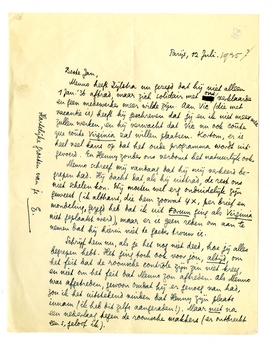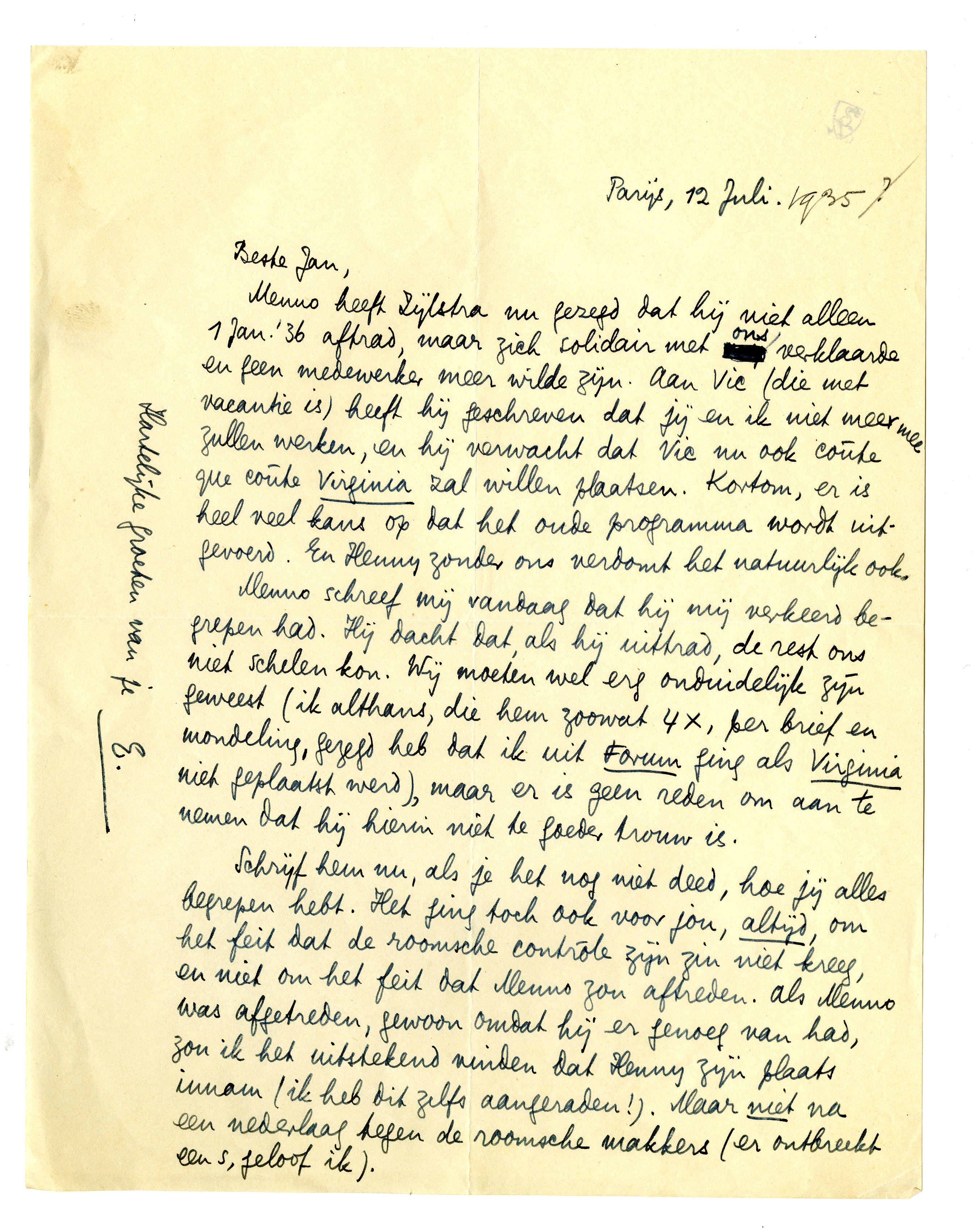 Menno heeft Zijlstra nu gezegd dat hij niet alleen 1 jan. '36 aftrad, maar zich solidair met ons verklaarde en geen medewerker meer wilde zijn. Aan Vic (die met vacantie is) heeft hij geschreven dat jij en ik niet meer mee zullen werken, en hij verwacht dat Vic nu ook coûte que coûte Virginia zal willen plaatsen. Kortom, er is heel veel kans op dat het oude programma wordt uitgevoerd. En Henny zonder ons verdomt het natuurlijk ook.