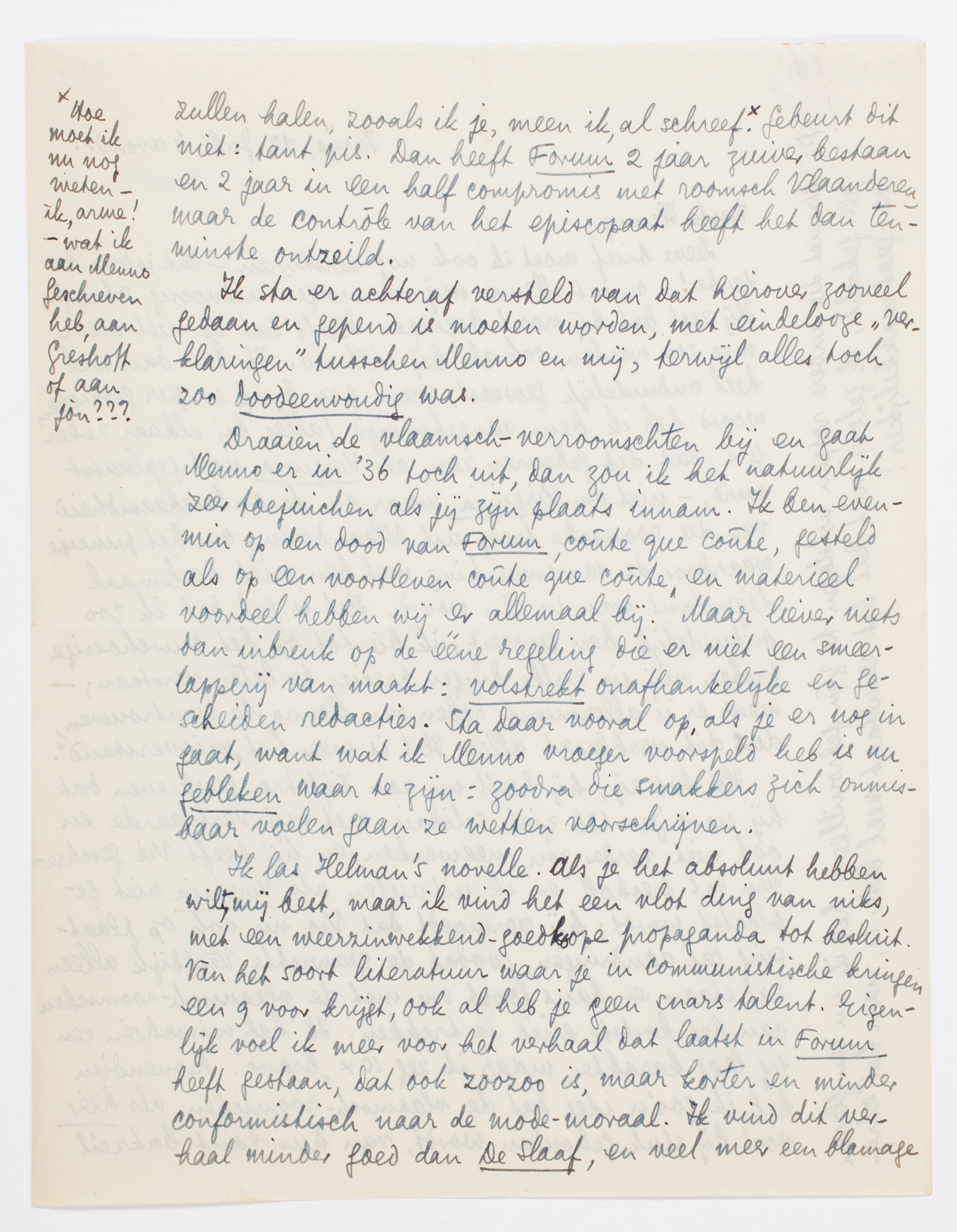 Draaien de vlaamsch-verroomschten bij en gaat Menno er in '36 toch uit, dan zou ik het natuurlijk zeer toejuichen als jij zijn plaats innam. Ik ben evenmin op den dood van Forum, coûte que coûte, gesteld als op een voortleven coûte que coûte, en materieel voordeel hebben wij er allemaal bij. Maar liever niets dan inbreuk op de ééne regeling die er niet een smeerlapperij van maakt: volstrekt onafhankelijke en gescheiden redacties. Sta daar vooral op, als je er nog in gaat, want wat ik Menno vroeger voorspeld heb is nu gebleken waar te zijn: zoodra die smakkers zich onmisbaar voelen gaan ze wetten voorschrijven.