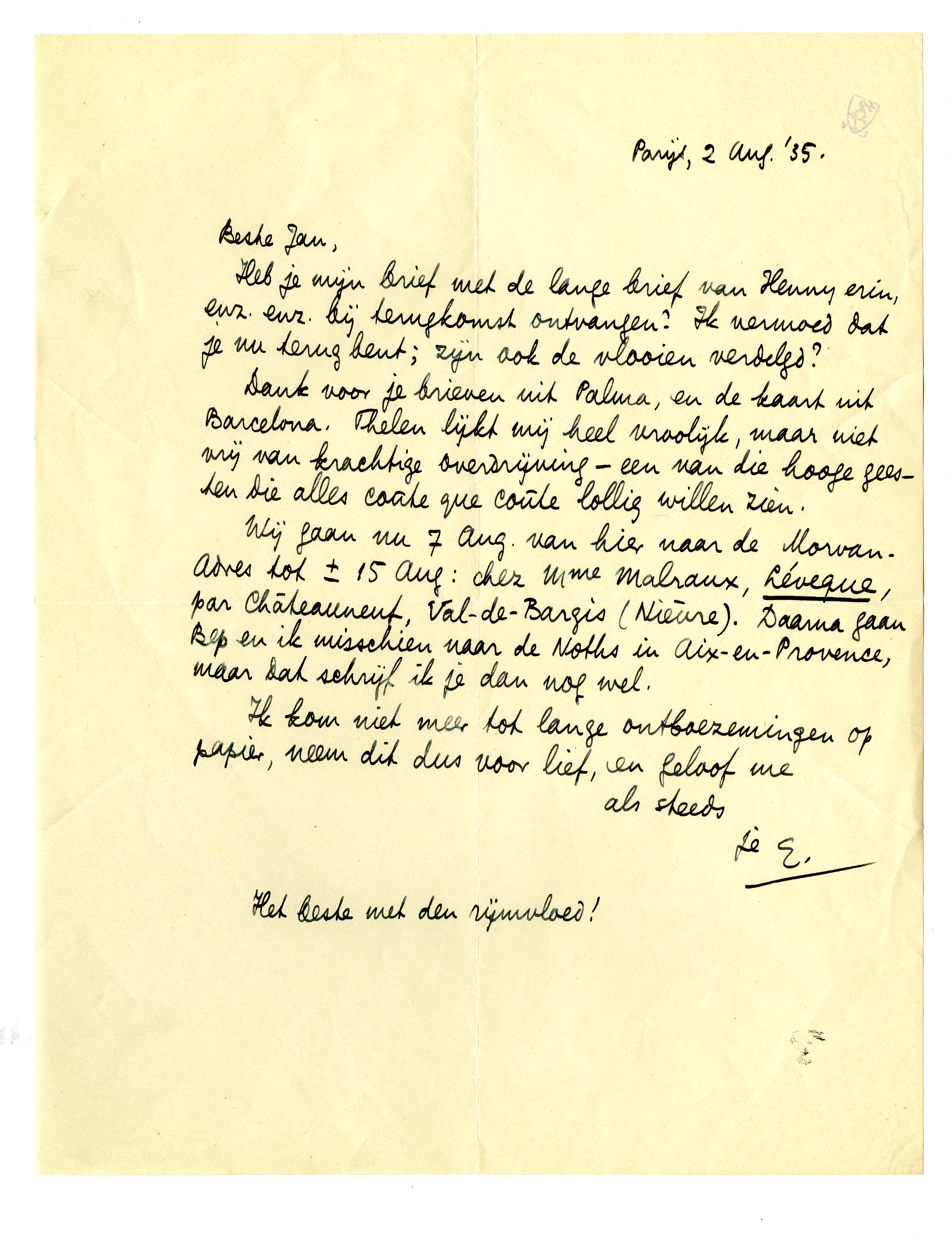 Wij gaan nu 7 Aug. van hier naar Morvan. Adres tot ± 15 Aug: chez Mme Malraux, Léveque, par Châteauneuf, Val-de-Bargis (Nièvre). Daarna gaan Bep en ik misschien naar de Noths in Aix-en-Provence, maar dat schrijf ik je dan nog wel.