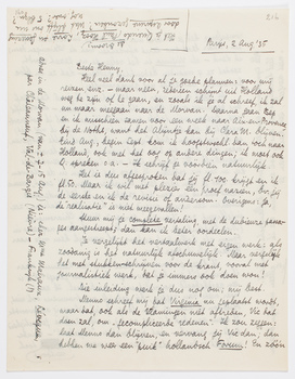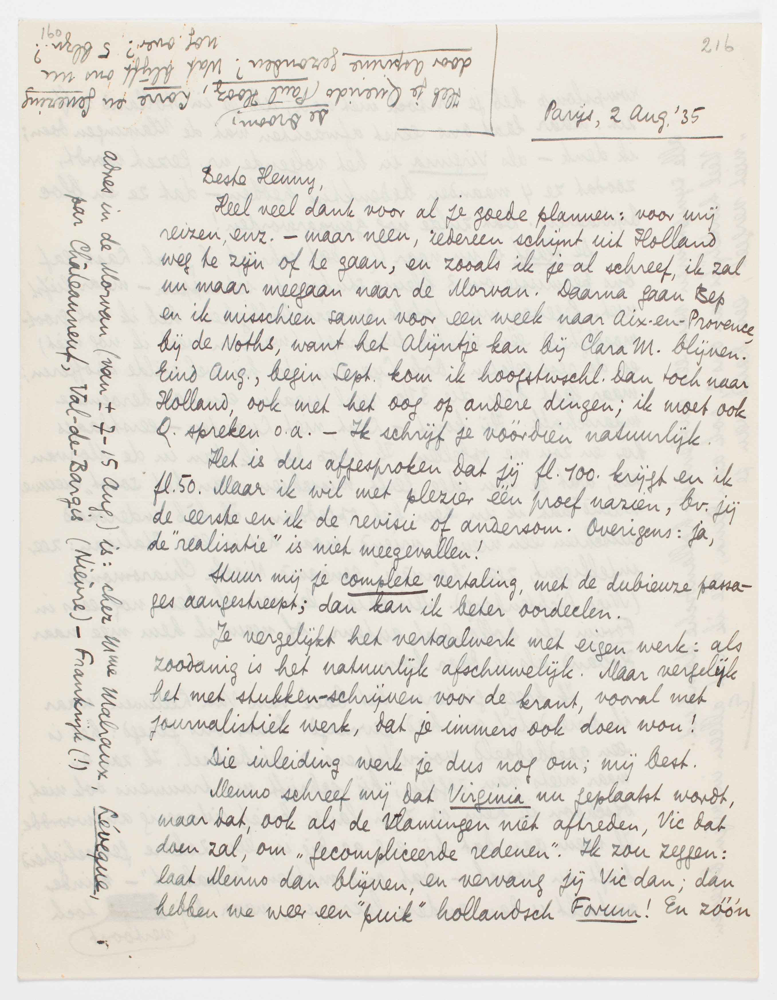 Heel veel dank voor al je goede plannen: voor mij reizen, enz. - maar neen, iedereen schijnt uit Holland weg te zijn of te gaan, en zooals ik je al schreef, ik zal nu maar meegaan naar de Morvan. Daarna gaan Bep en ik misschien samen voor een week naar Aix-en-Provence, bij de Noths, want het Alijntje kan bij Clara M. blijven. Eind Aug., begin Sept. kom ik hoogstwschl. dan toch naar Holland, ook met het oog op andere dingen; ik moet ook Q. spreken o.a. - Ik schrijf je vóórdien natuurlijk.
