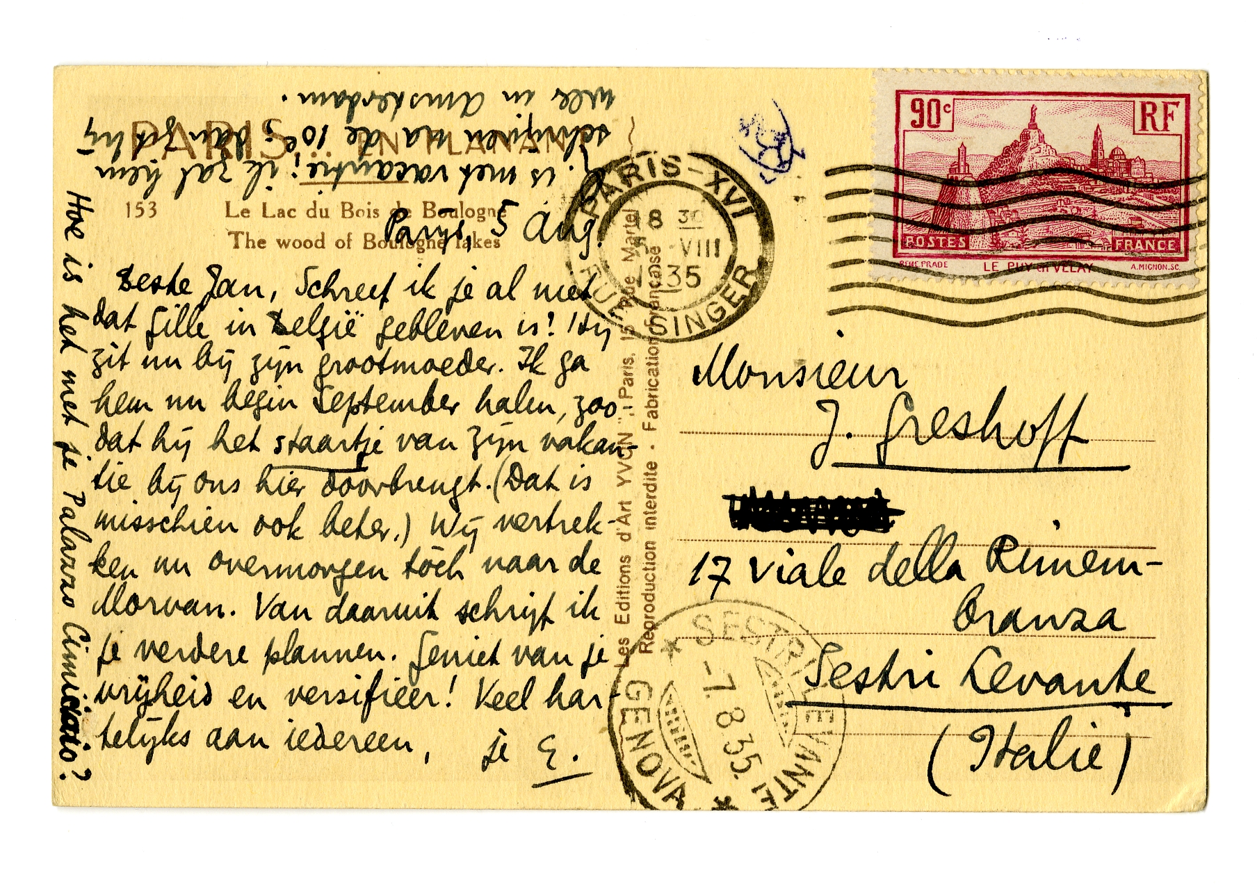 Beste Jan, Schreef ik je al niet dat Gille in België gebleven is? Hij zit nu bij zijn grootmoeder. Ik ga hem nu begin September halen, zoodat hij het staartje van zijn vakantie bij ons hier doorbrengt. (Dat is misschien ook beter.) Wij vertrekken nu overmorgen tòch naar de Morvan. Van daaruit schrijf ik je verdere plannen. Geniet van je vrijheid en versifieer! Veel hartelijks aan iedereen,