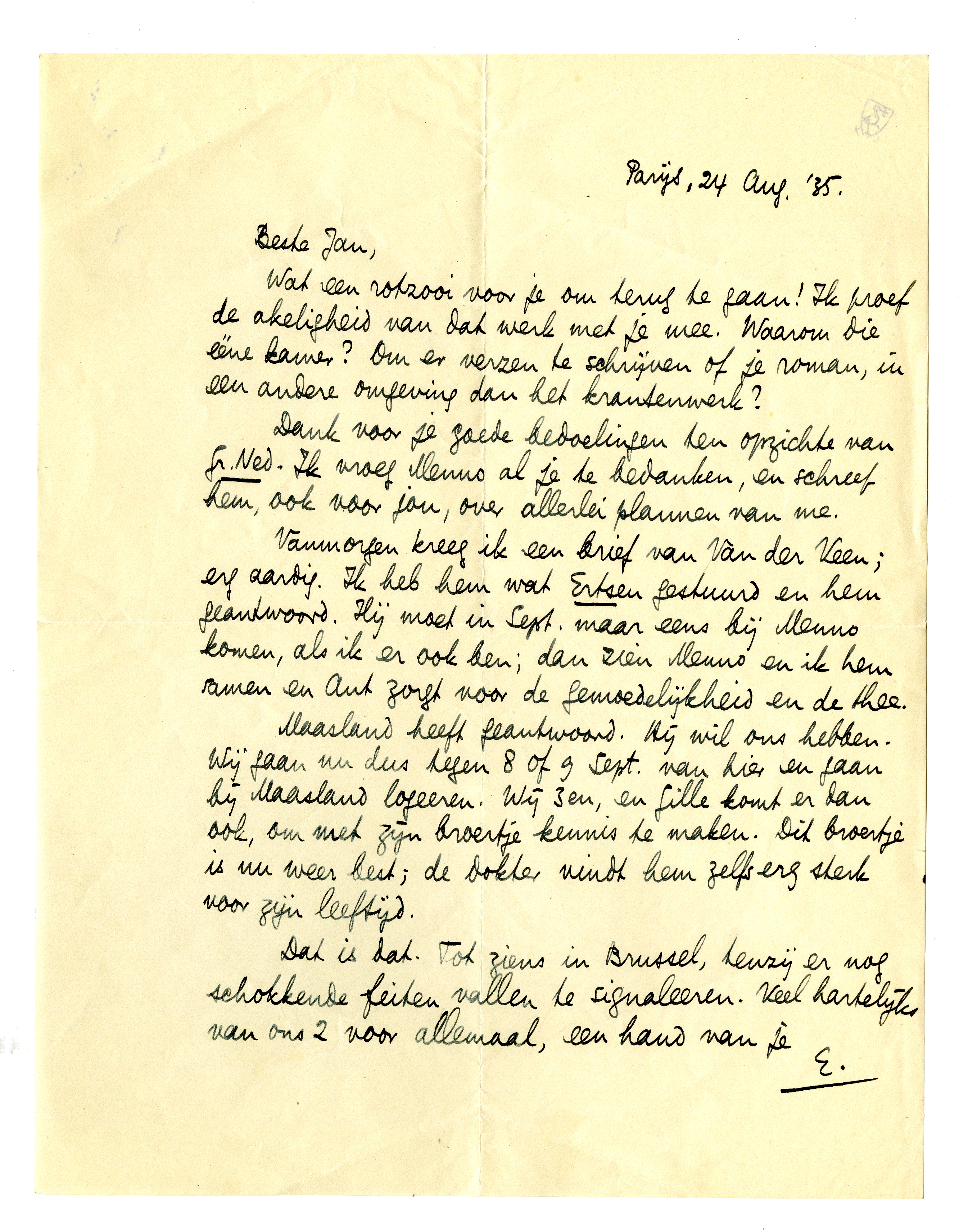 Vanmorgen kreeg ik een brief van Van der Veen; erg aardig. Ik heb hem wat Ertsen gestuurd en hem geantwoord. Hij moet in Sept. maar eens bij Menno komen, als ik er ook ben; dan zien Menno en ik hem samen en Ant zorgt voor de gemoedelijkheid en de thee.